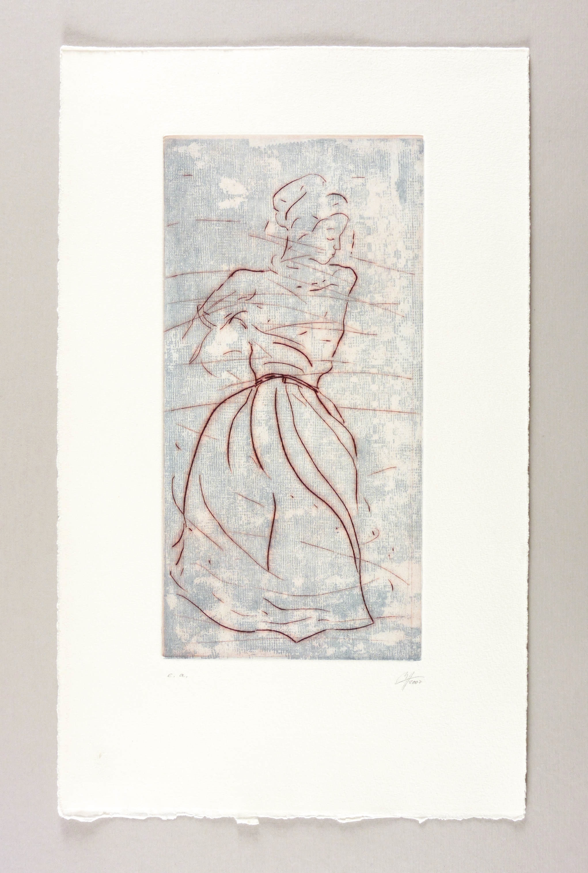 2007. Farbradierung / Vernis mou & Kaltnadel, in Grau & Dunkelrot, auf schwerem hellchamois Velin. – Originale Künstlergrafik, von Madeleine Heublein. – Künstlerexemplar (e.a.). – 29,6 x 14,7 cm (Darstellung / Platte), 44 x 27 cm (Blatt).
