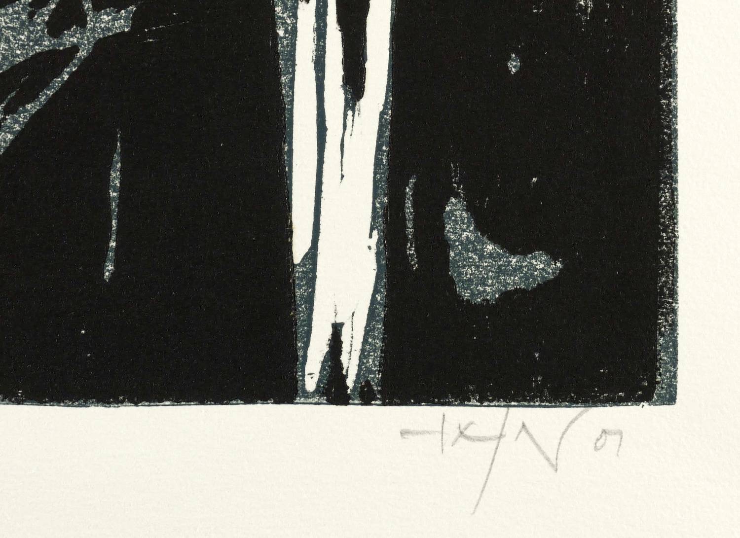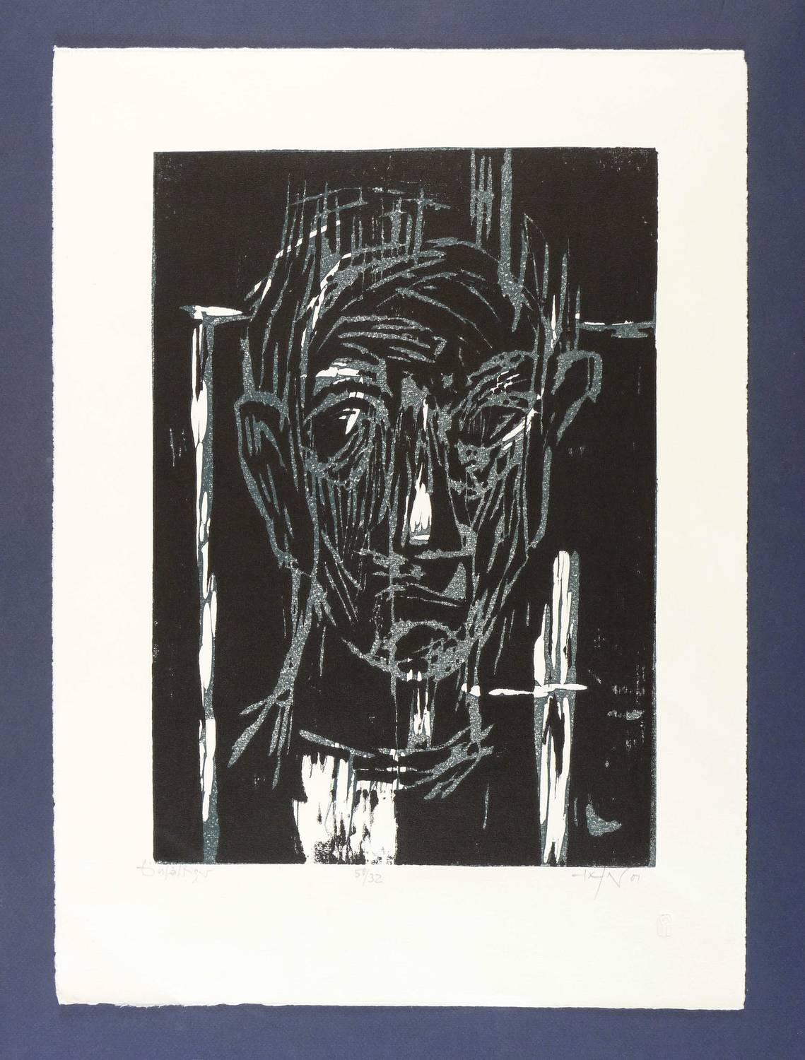 2001. Farbholzschnitt, in Blaugrau & Schwarz, auf Hahnemühle-Bütten. – Originale Künstlergrafik, von Heinz Tetzner. – Auflage Exemplar Nr. 32/50. – 40,1 x 28,2 cm (Darstellung / Druckstock), 54 x 39 cm (Blatt).
