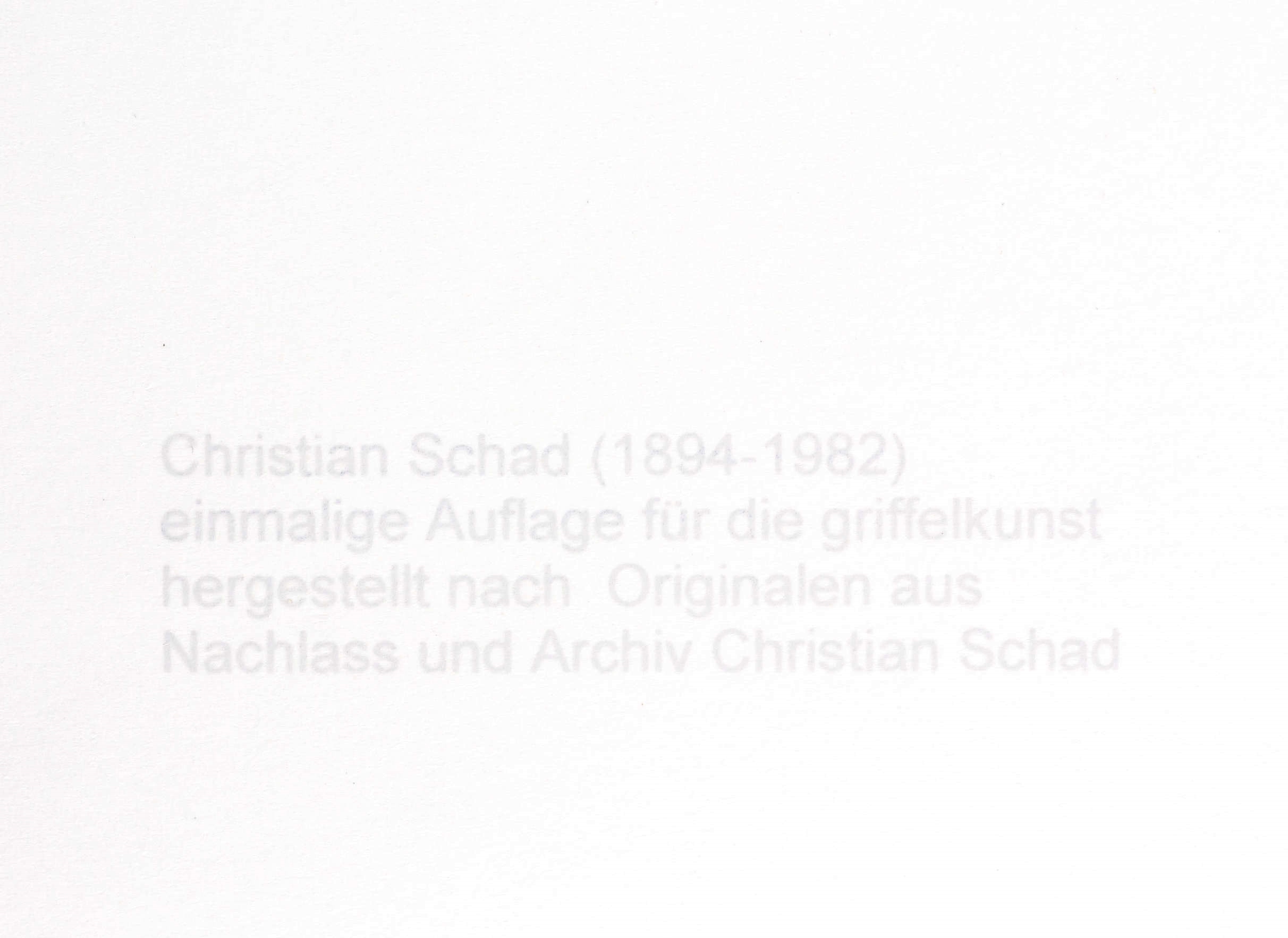 Christian Schad (1894 Miesbach - 1982 Stuttgart). Deutscher Maler, Grafiker und Fotografiker. Namhafter Vertreter der Neuen Sachlichkeit, des Verismus und Dadaismus. 1913/14 Studium an der Kunstakademie in München bei Heinrich von Zügel und Carl Johann Becker-Gundahl. Erste expressionistische Holzschnitte. 1914 Aufenthalt in der Malerkolonie Volendam am IJsselmeer (Nordholland). 1915-20 längerer Aufenthalt in der Schweiz. Zunächst in Zürich Anschluss an die dortige Dada-Bewegung um Hans Arp, Hugo Ball, Leonhard Frank und Walter Serner, mit dem er die Avantgarde-Zeitschrift "Sirius" herausgibt. 1916 Umzug nach Genf und Aufnahme kubistischer Formsprache. 1918 Entwicklung der "Schadographien", sogenannte Fotogramme ohne Kamera und Linse. 1920 kurz in München, dann in Rom Kontakt mit der italienischen DADA-Bewegung. 1921 in Neapel erste Gemälde im Stil der Neuen Sachlichkeit. 1922 in München Erledigung zahlreicher Porträt-Aufträge. 1925 Übersiedlung nach Wien, wo er 1927 an der neusachlichen Gruppenausstellung im Salon Würthle teilnimmt. 1927 erste Monografie "Der Maler Christian Schad" von Max Osborn bei Paul Steegemann in Berlin. 1928 Umzug nach Berlin und Teilnahme an der Ausstellung "Deutsche Kunst" in Düsseldorf. 1929 Teilnahme an der Ausstellung "Die Neue Sachlichkeit" in Amsterdam. Ab 1930 wieder zahlreiche Porträt-Aufträge. 1933-45 von den Nationalsozialisten als "entartet" diffamiert. Ab 1935 als kaufmännischer Vertreter einer bayrischen Brauerei in Berlin tätig. 1943-47 Kopie der "Stuppacher Madonna" von Matthias Grünewald für die Stadt Aschaffenburg. Ab 1950 entsteht die Werkgruppe der "Magischen Bilder". Ab 1954 verstärkt mehrfarbige Druckgrafik, ab 1957 Radierungen. Ab 1960 nochmalige Beschäftigung mit der Technik der "Schadographie". 1962 Umzug nach Keilberg im Spessart. In den 1970er Jahren Annäherung an den Realismus.