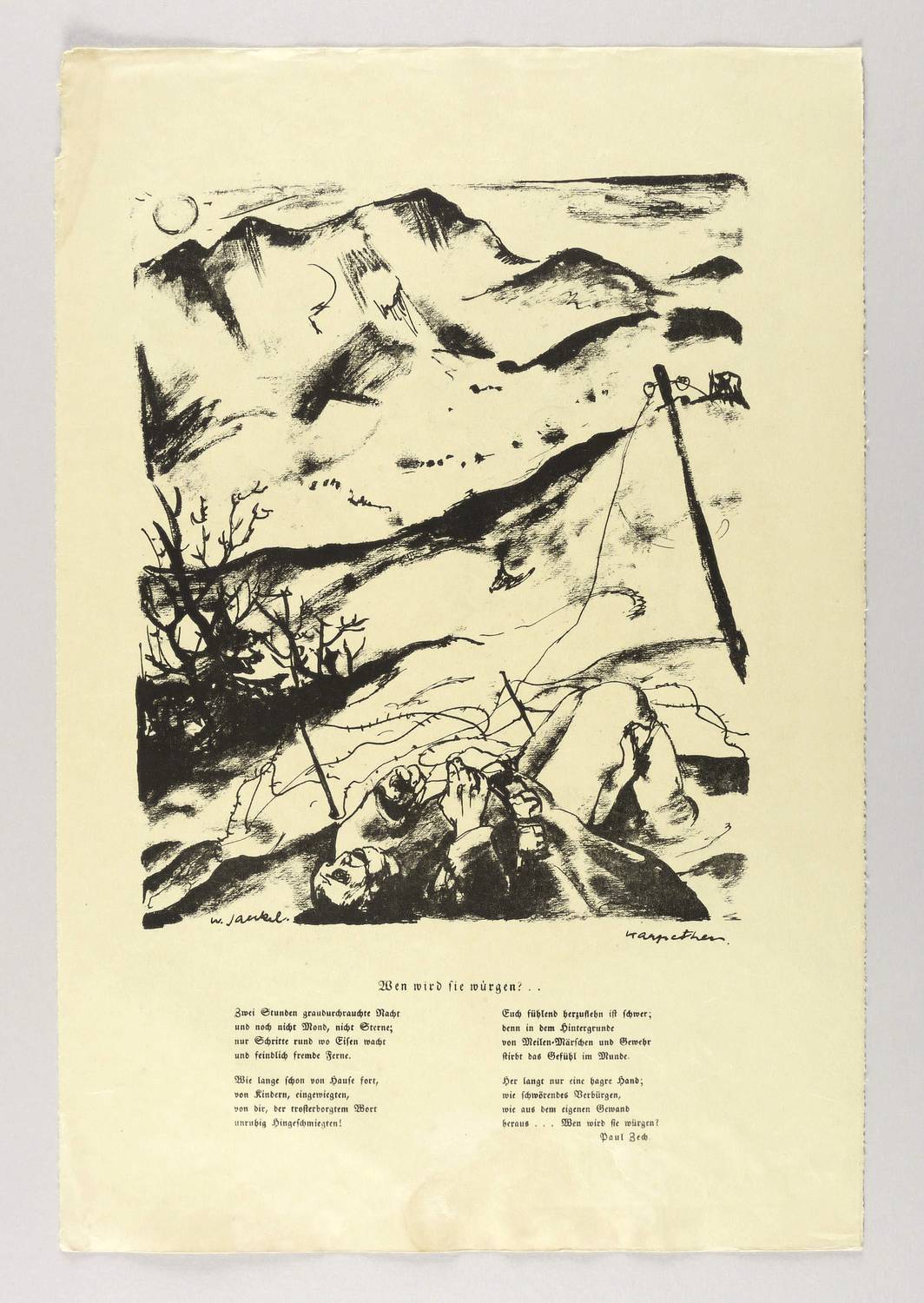 Stilijanov-Nedo 64. – Aus: Kriegszeit. Künstlerflugblätter (Berlin: Paul Cassirer & Alfred Gold 1914-1916). – Nicht handsigniert .Im Stein signiert links unten. Rechts Titel. Unterhalb typografischer Text mit einem Gedicht ″Wen wird sie würgen?″ von Paul Zech. – Rückseitig weitere Lithografie von Hans Meid ″Straßenwache″. – Im Rand links oben und unten etwas fleckig. Durchgehend leicht knickspurig. Insgesamt mäßig gut erhalten.