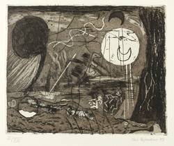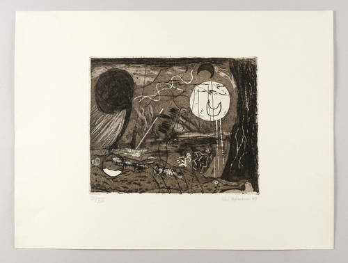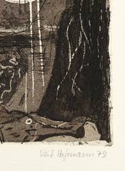 1979. Radierung / Aquatinta & Reservage, in Violettschwarz, auf gehämmertem hellgelbem Karton. – Originale Künstlergrafik, von Veit Hofmann. – Auflage Exemplar Nr. III/XIII. – 21,6 x 26,5 cm (Darstellung / Platte), 38 x 50 cm (Blatt).