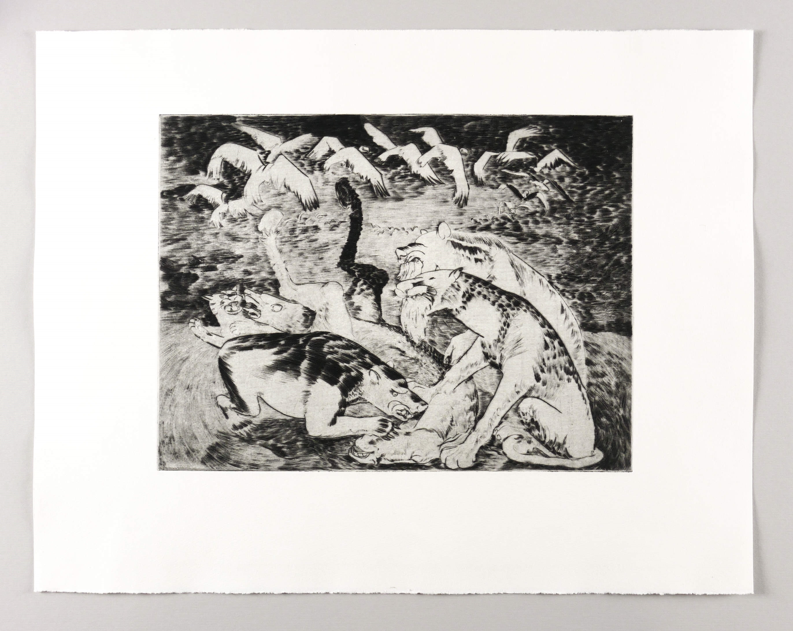 1936. Radierung / Strichätzung, mit Plattenton, in Schwarz, auf hellgelbem Velin. – Originale Künstlergrafik, von Hans Grundig. – Auflage Exemplar Nr. 46/50. – 24,9 x 33,0 cm (Darstellung / Platte), 40 x 50 cm (Blatt).