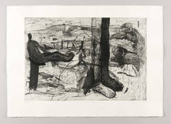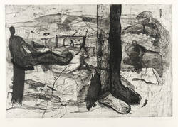 1987. Radierung / Strichätzung & Aquatinta, in Schwarz, auf gelbem Hahnemühle. – Originale Künstlergrafik, von Bernd Schlothauer. – Auflage Exemplar Nr. 42/75. – 29,5 x 43,2 cm (Darstellung / Platte), 40 x 55 cm (Blatt).