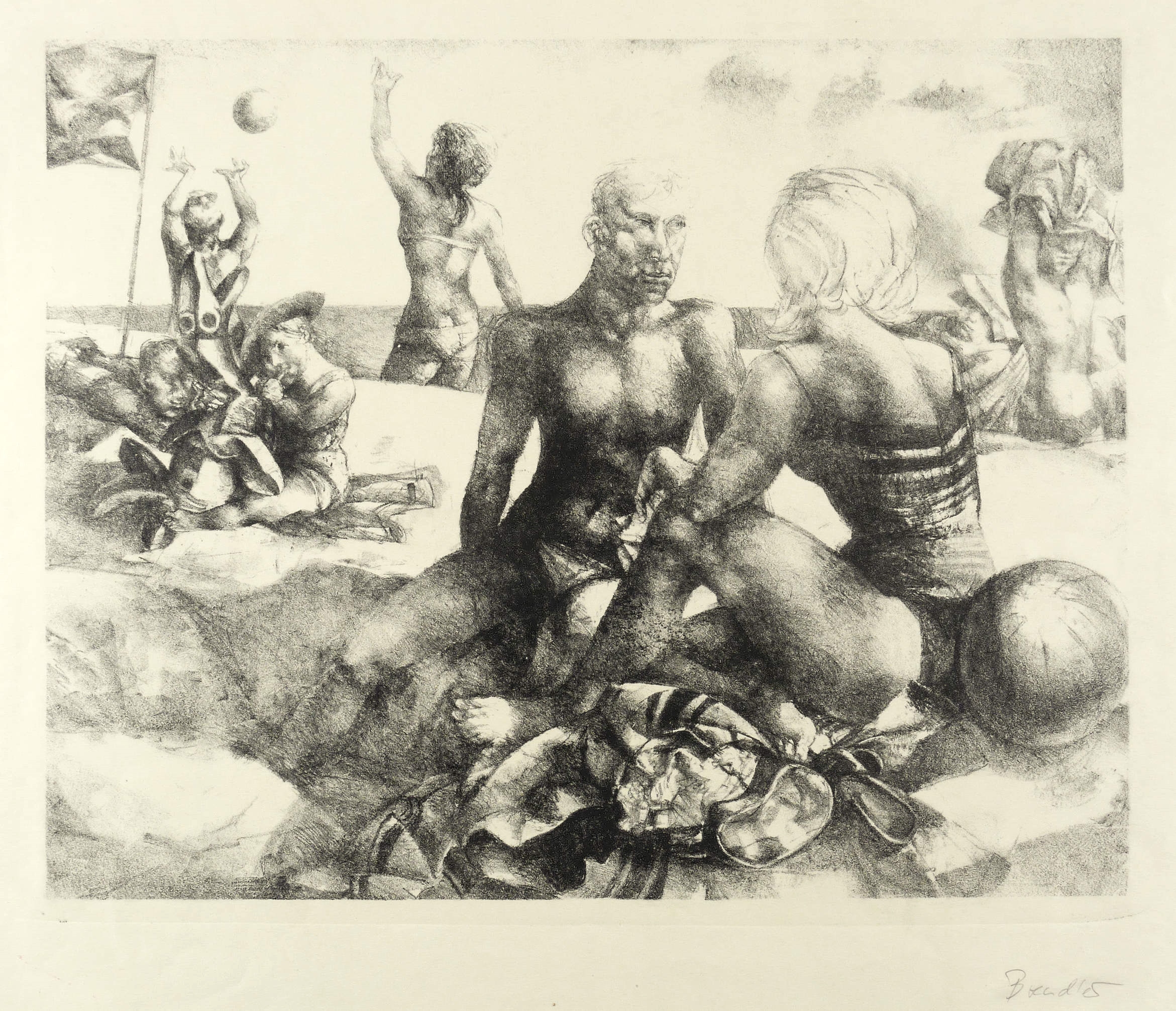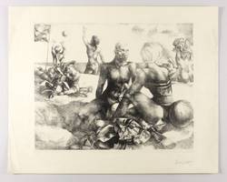 1980-1985. Lithografie / Kreidelithografie, in Schwarz, auf hartem gelbem Velin. – Originale Künstlergrafik, von Georg Brendler. – 36,1 x 45,2 cm (Darstellung / Druckbild), 38,0 x 48,5 cm (Stein), 48 x 60 cm (Blatt).