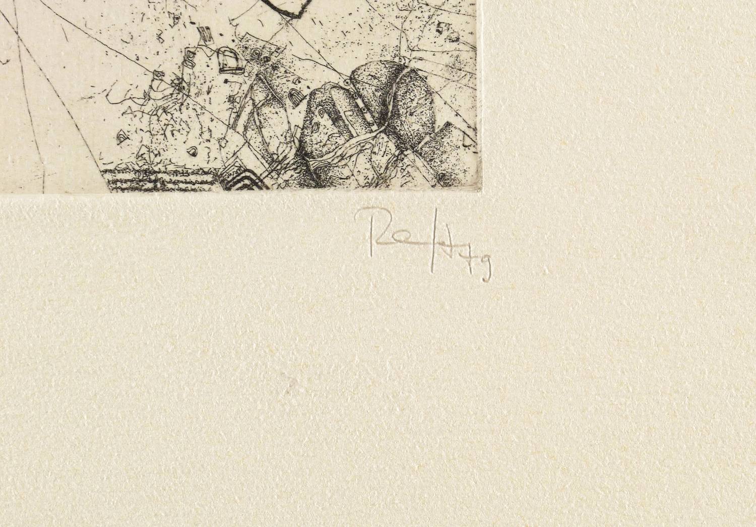 1979. Radierung / Strichätzung, in Schwarz, auf weichem chamois Hahnemühle-Bütten. – Originale Künstlergrafik, von Thomas Ranft. – Auflage 50 Exemplare. – 19,6 x 20,1 cm (Darstellung / Platte), 51 x 38 cm (Blatt).