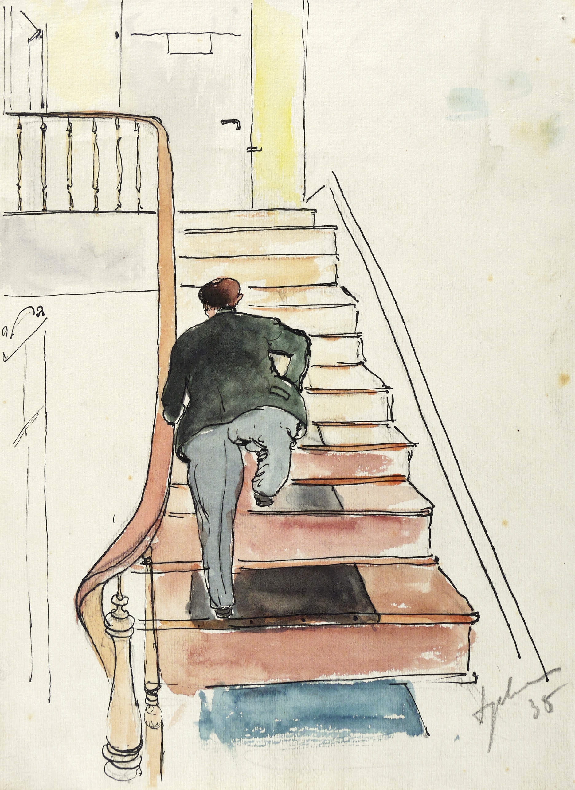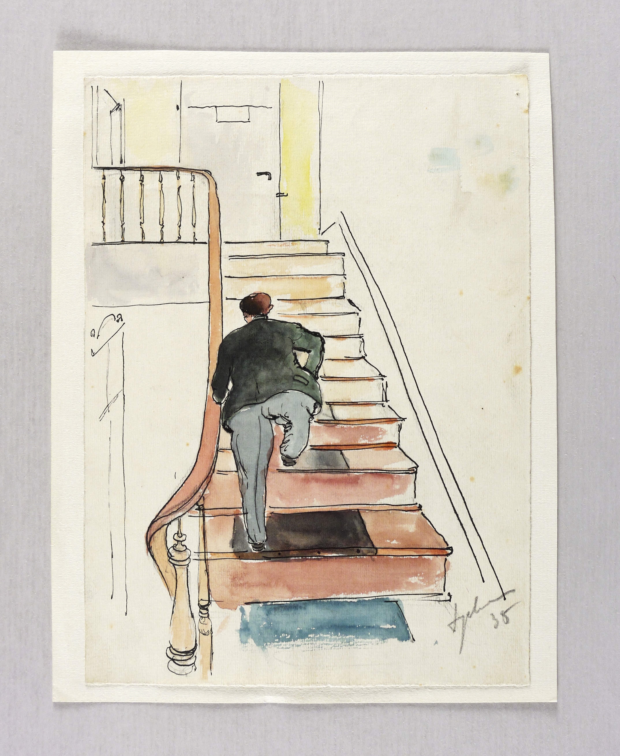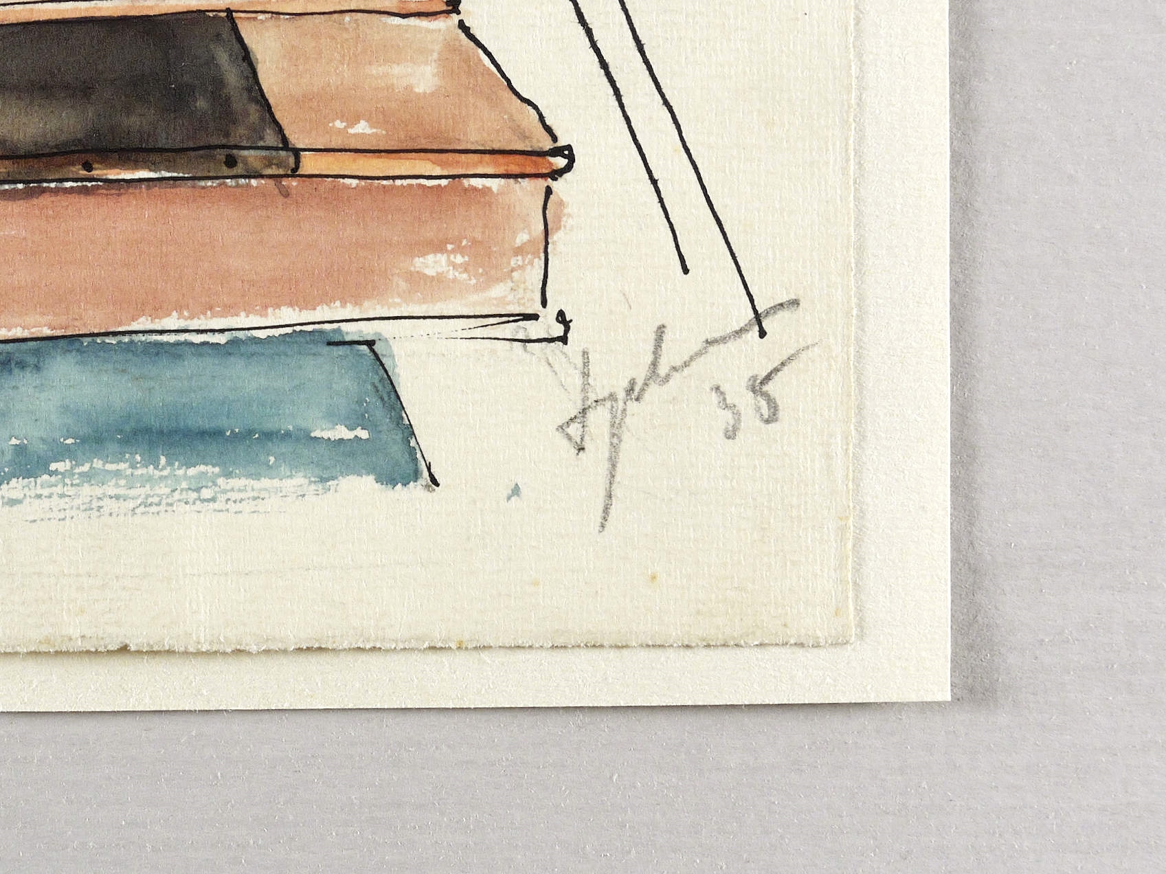 1935. Zeichnung / Feder, in schwarzer Tusche, über Bleistift, aquarelliert, auf leichtem Bütten. – Originale Künstlergrafik, von Wilhelm Engelmann. – Unikat. – 18,4 x 13,3 cm (Darstellung / Blatt), 20 x 15 cm (Trägerblatt).