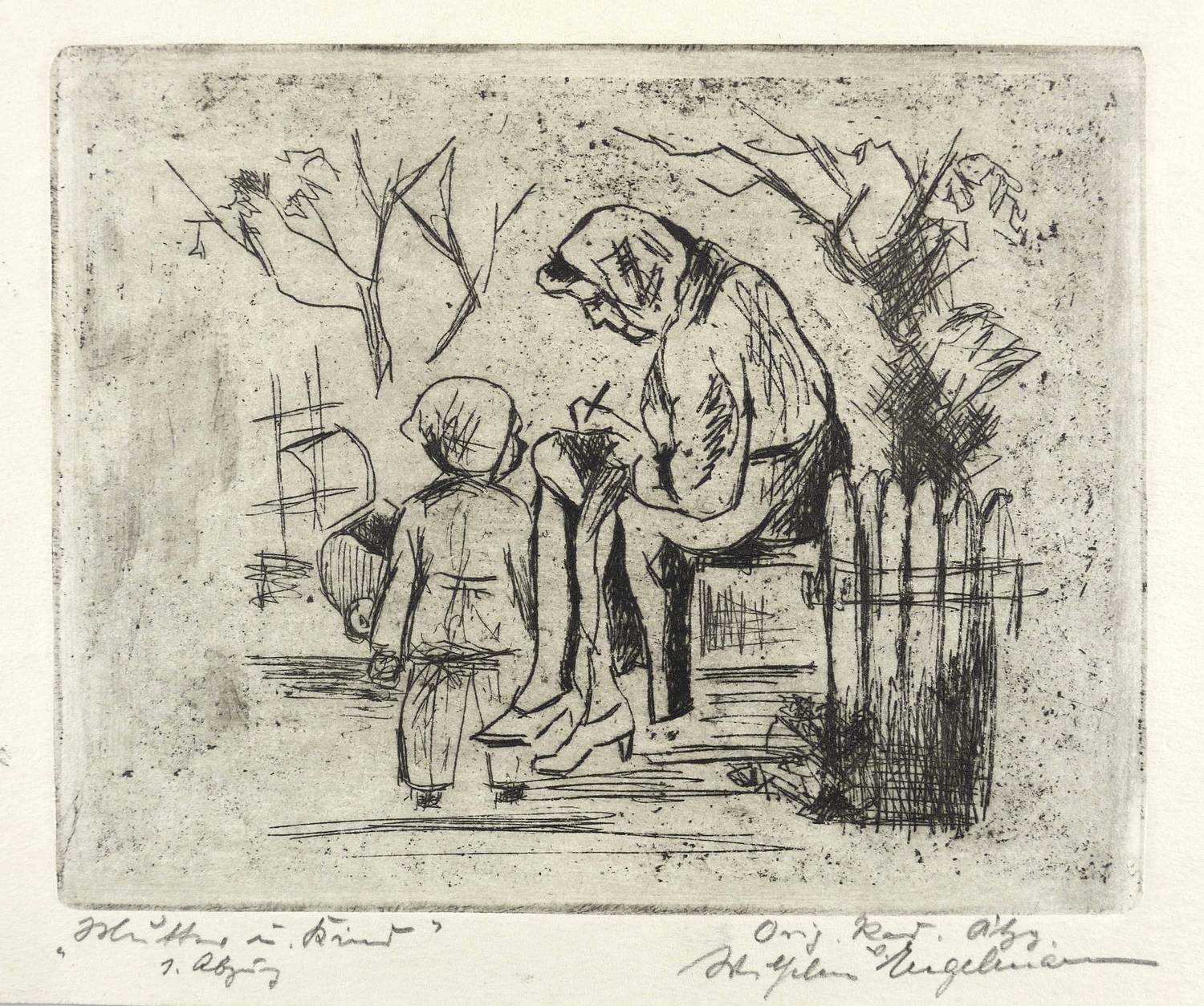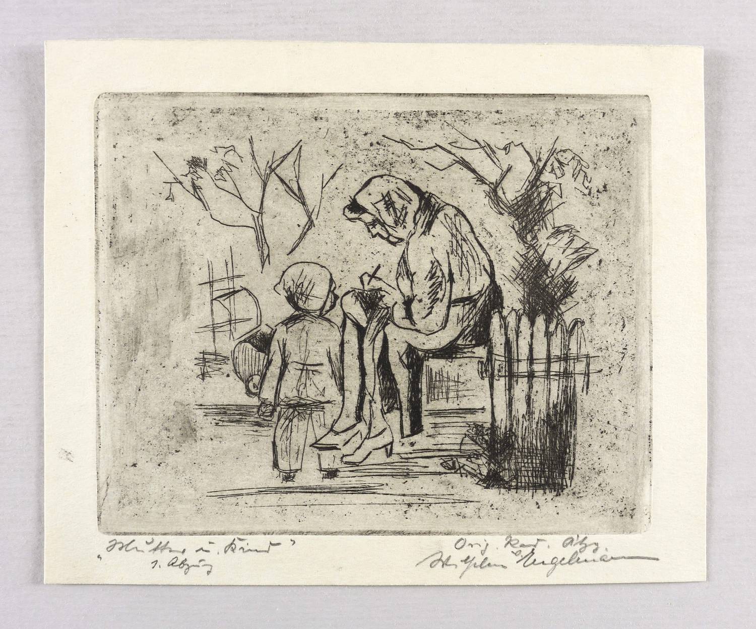 Rechts unten in Bleistift signiert: ″Wilhelm Engelmann″. Links Titel und Bezeichnung: ″Mutter u. Kind / 1. Abzug″. – Sehr guter Zustand.