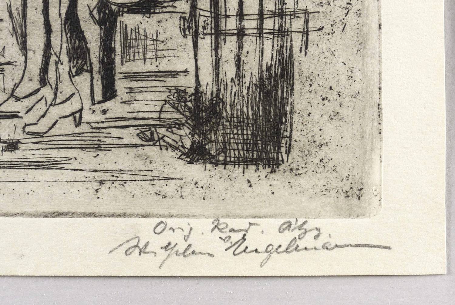 Um 1949. Radierung / Vernis mou & Kaltnadel, in Schwarz, auf gelbem Velinkarton. – Originale Künstlergrafik, von Wilhelm Engelmann. – 11,8 x 14,8 cm (Darstellung / Platte), 15 x 18 cm (Blatt).