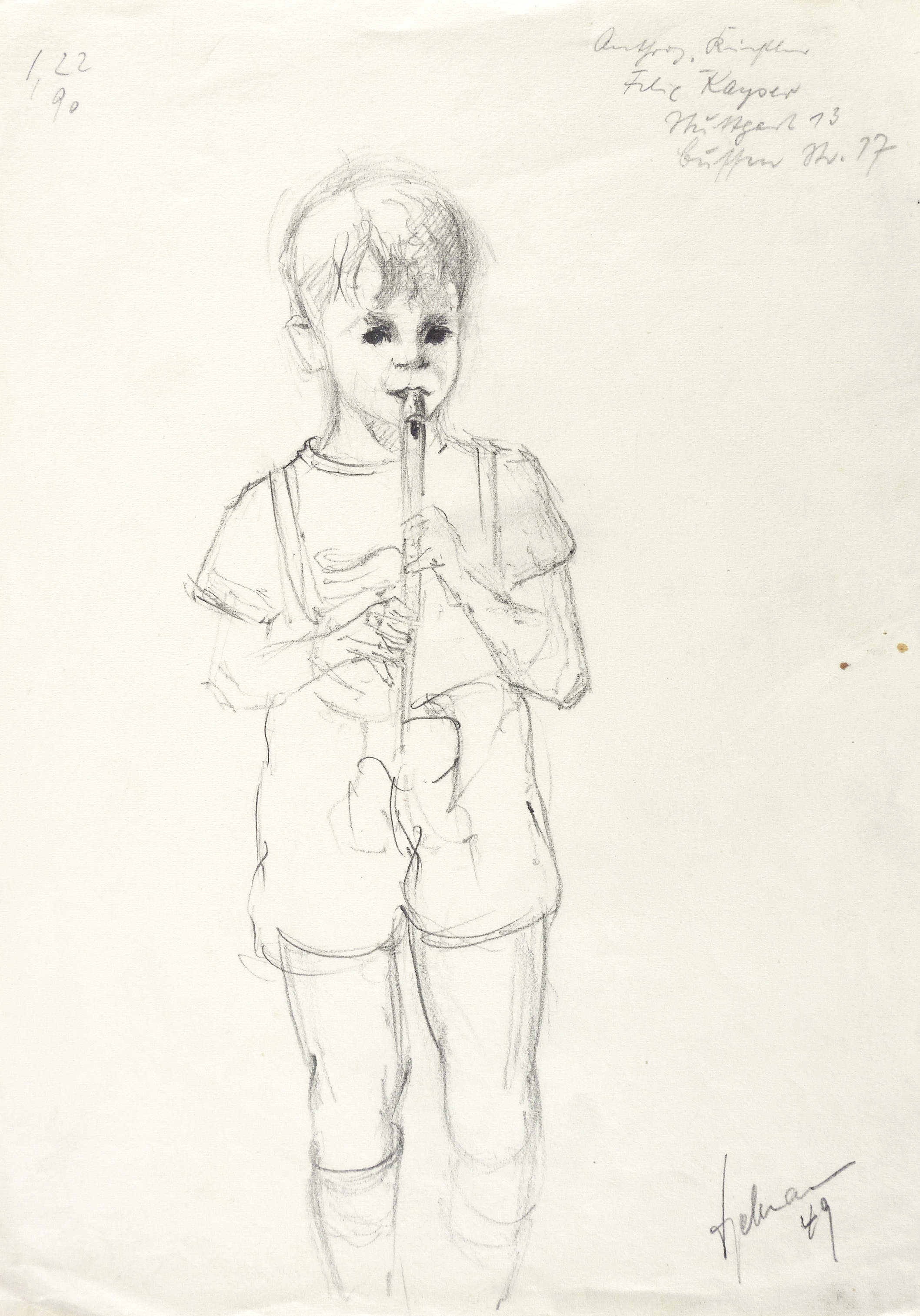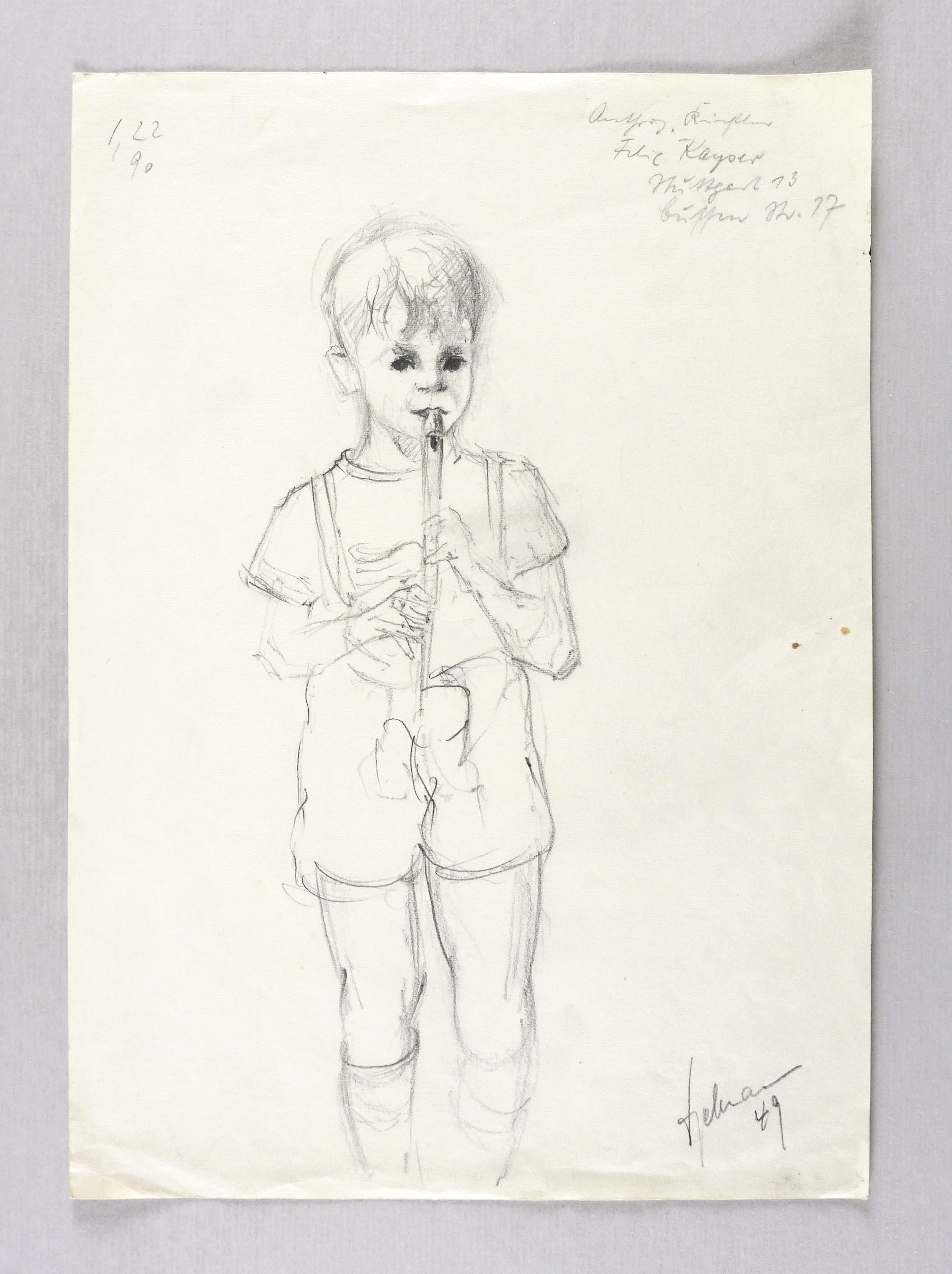 Rechts unten in Bleistift signiert und datiert: ″Engelmann 49″. Rechts oben bezeichnet: ″Anthrop[osophischer]. Künstler / Felix Kayser / Stuttgart 13 / Bussen Str. 17″. – Die Adresse des anthroposophischen Künstlers auf dem Blatt legt nahe, dass es sich bei dem spielenden Jungen um ein Kind von ihm handeln könnte. – Im unteren Rand etwas knickspurig. Im rechten Rand zwei kleine Flecken. Mäßig guter Zustand.
