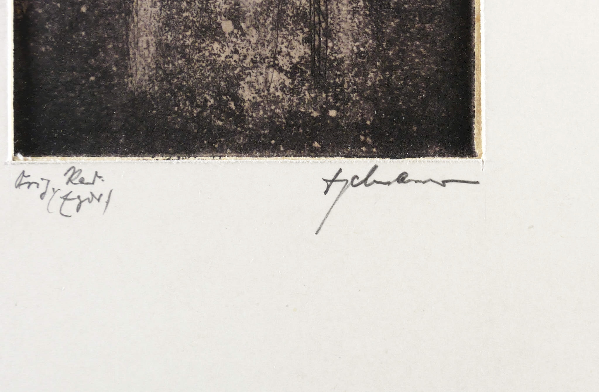 1952. Radierung / Aquatinta, in Schwarzviolett, auf hellchamois Velinkarton. – Originale Künstlergrafik, von Wilhelm Engelmann. – 12,9 x 9,1 cm (Darstellung / Platte), 26 x 17 cm (Blatt), 33 x 23 cm (Passepartout).