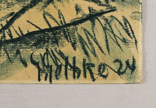 1924. Zeichnung / Ölkreide, in dunklem Moosgrün, partiell gewischt, auf gelbem J.W.-Zanders. – Originale Künstlergrafik, von Georg Gelbke. – Unikat. – 39,0 x 51,0 cm (Darstellung / Blatt).