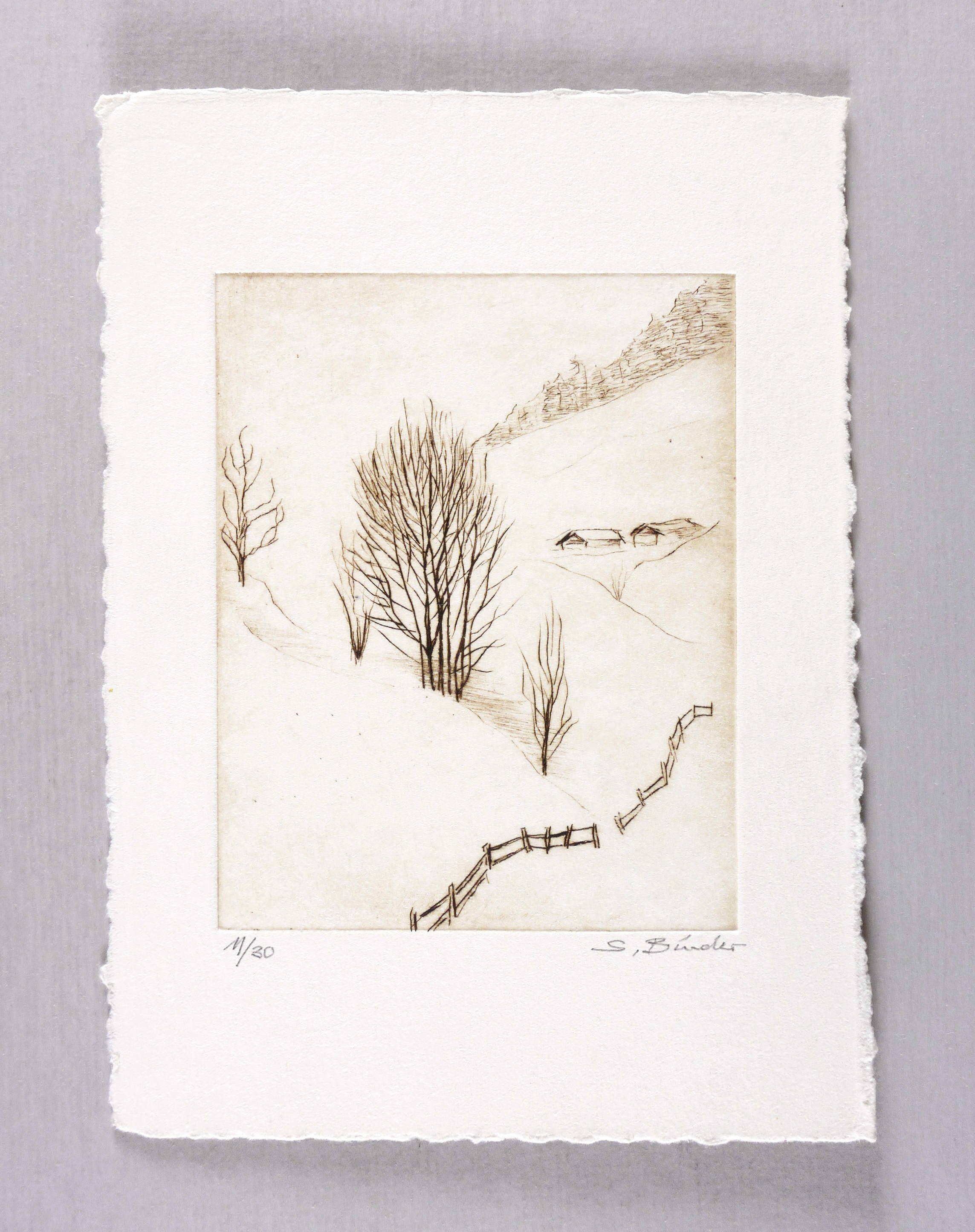 1970-1980. Radierung / Kaltnadel, in Schwarzbraun, auf hellchamois Velinkarton. – Originale Künstlergrafik, von Sepp Binder. – Auflage Exemplar Nr. 11/20. – 13,0 x 10,1 cm (Darstellung / Platte), 15 x 16 cm (Blatt).