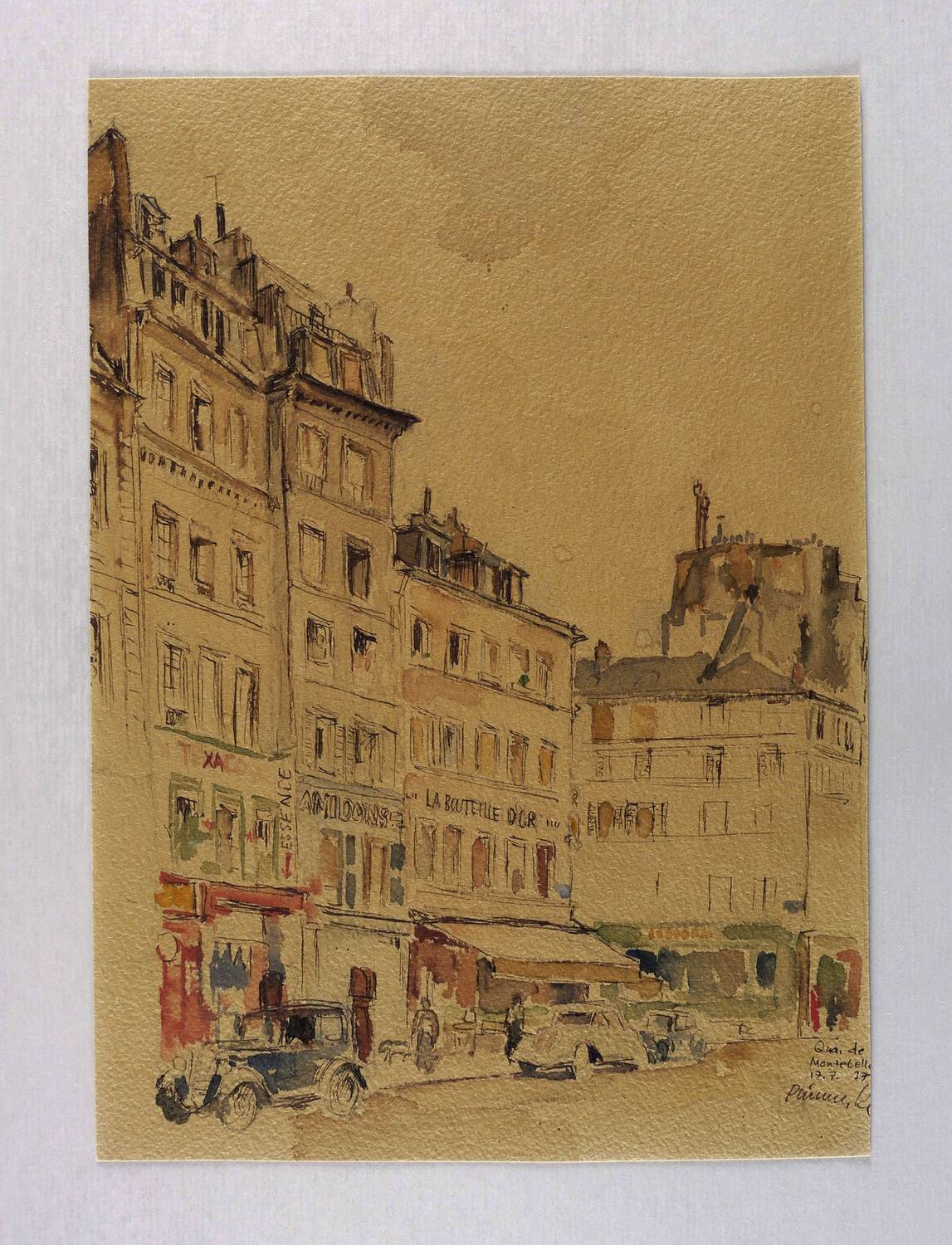 1937. Mischtechnik / Aquarell & Tusche, auf gelbem Aquarellkarton. – Originale Künstlergrafik, von Französisch (20. Jh.). – Unikat. – 28,3 x 20,2 cm (Darstellung / Blatt).