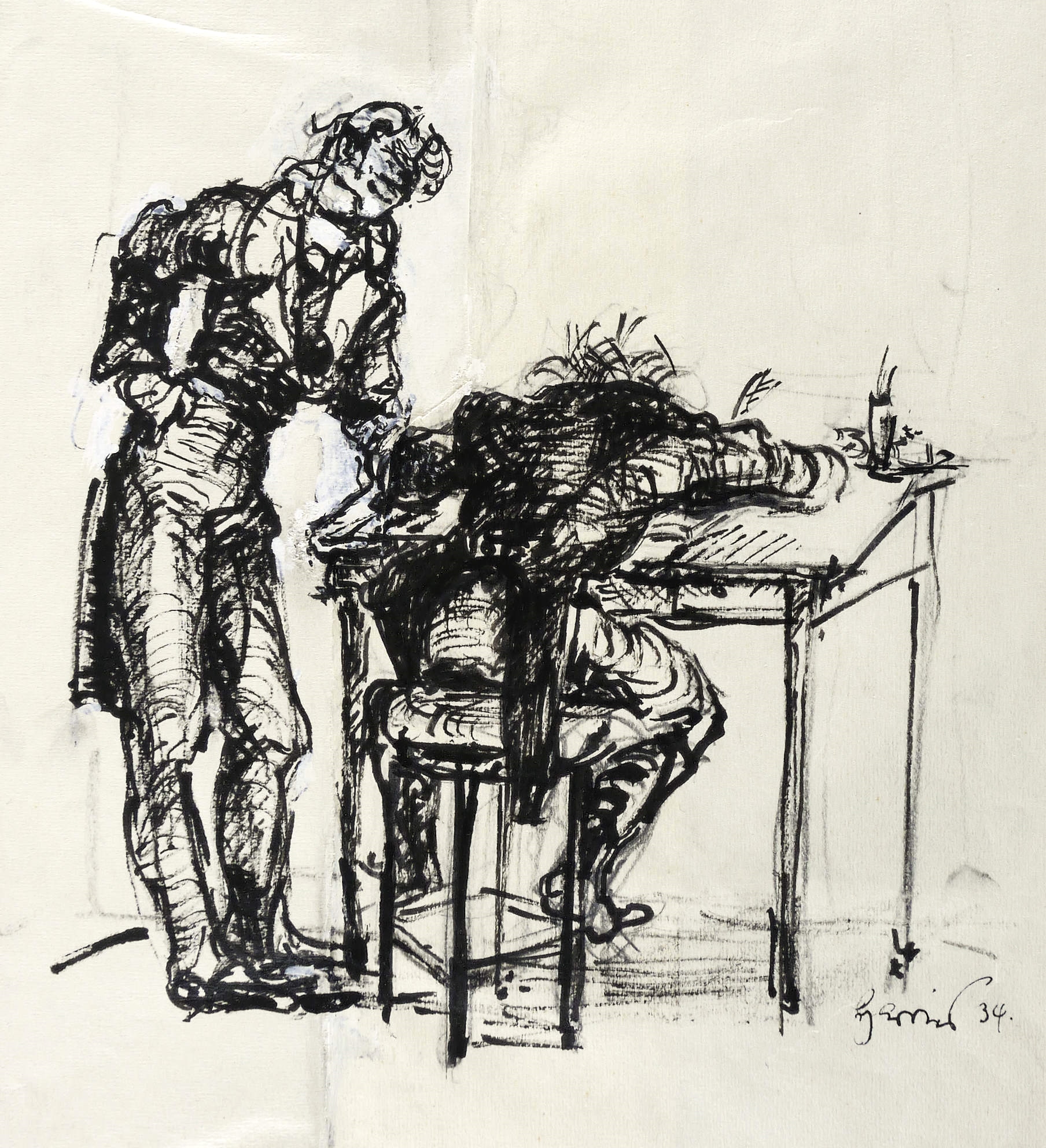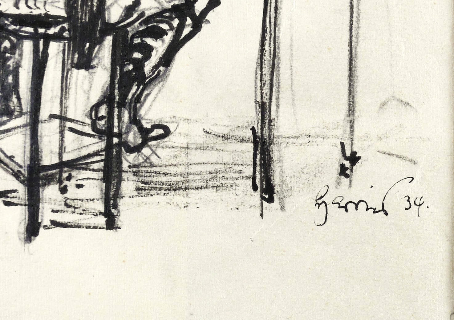 Rechts unten in schwarzer Feder signiert: ″Harries 34″. – Auf zwei miteinander verleimten Papierstücken. Original hinter Passepartout montiert. Geringfügig knickspurig. Mäßig gut erhalten.