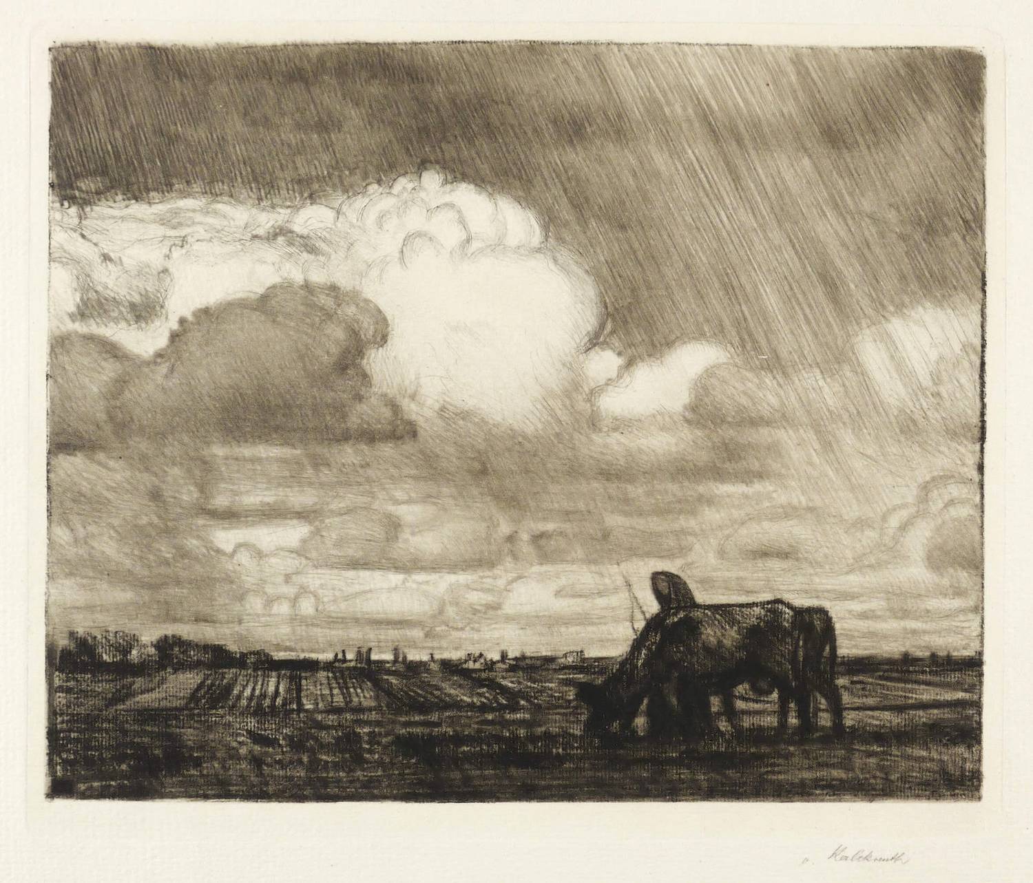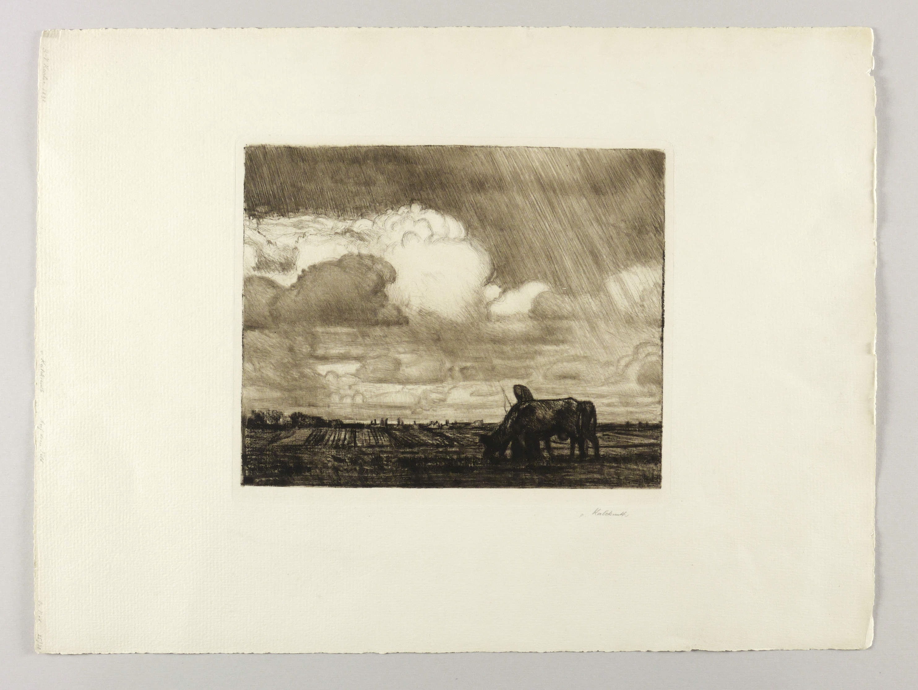 1898. Radierung / Vernis mou, Roulette & Kaltnadel, in Schwarzbraun, auf gelbem genarbtem Velinkarton. – Von Leopold Graf von Kalckreuth. – AUflage Exemplar Nr. 25/30. – 25,0 x 30,7 cm (Darstellung / Druckbild), 26,9 x 31,9 cm (Platte), 46 x 61 cm (Blatt).