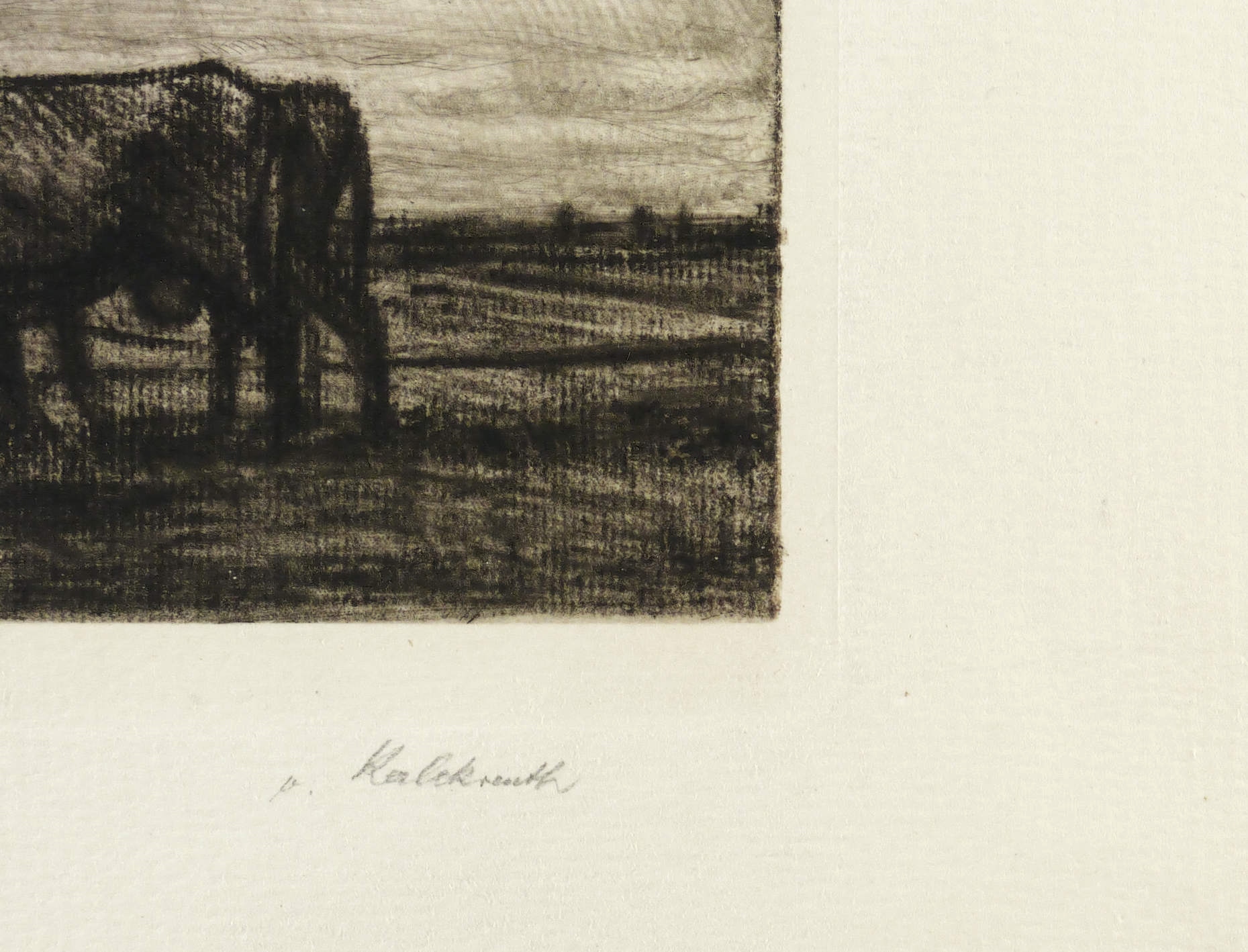 Rechts unten in Bleistift bezeichnet: "v. Kalckreuth" Am linken Blattrand Jahr, Titel und Auflagenbezeichnung. – Seltenes, technisch interessantes Blatt des Künstlers für den Karlsruher Kunstverein. – Im Rand leichte Altersspuren, minimal angestaubt und knickspurig. Guter Gesamtzustand.