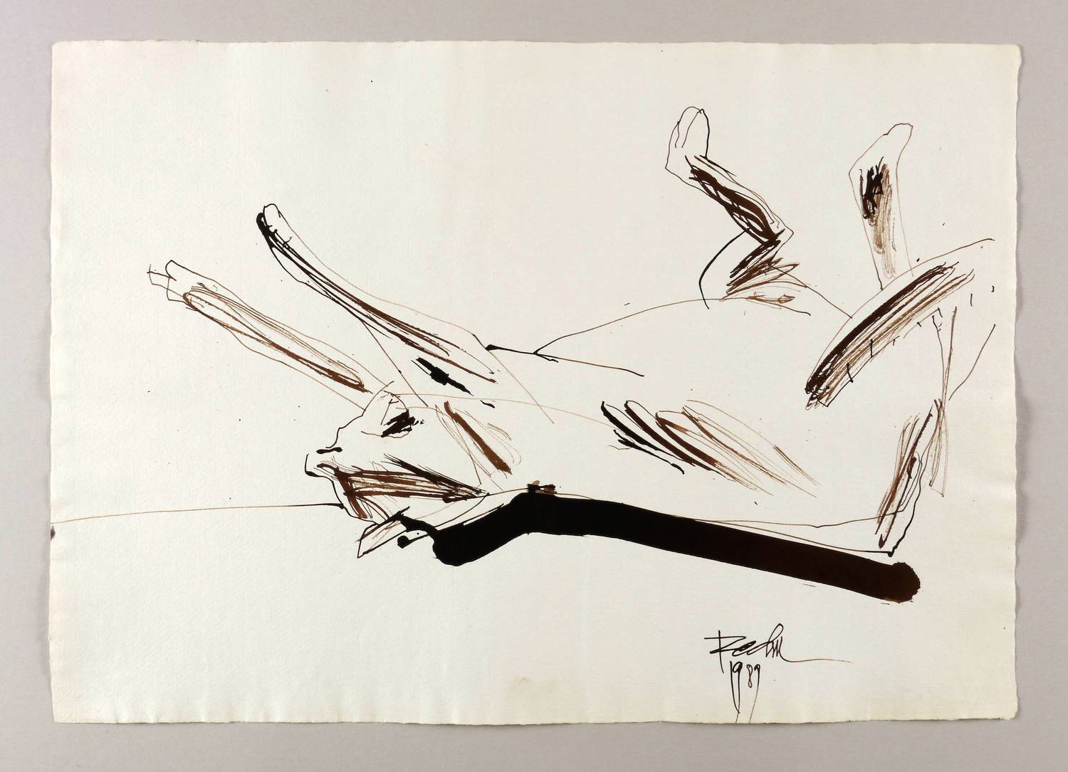 1989. Zeichnung / Feder- & Pinselzeichnung, in brauner Tusche, auf rauem hellchamois Losin-Bütten. – Von Günther Rechn. – 42,0 x 59,0 cm (Darstellung / Blatt).