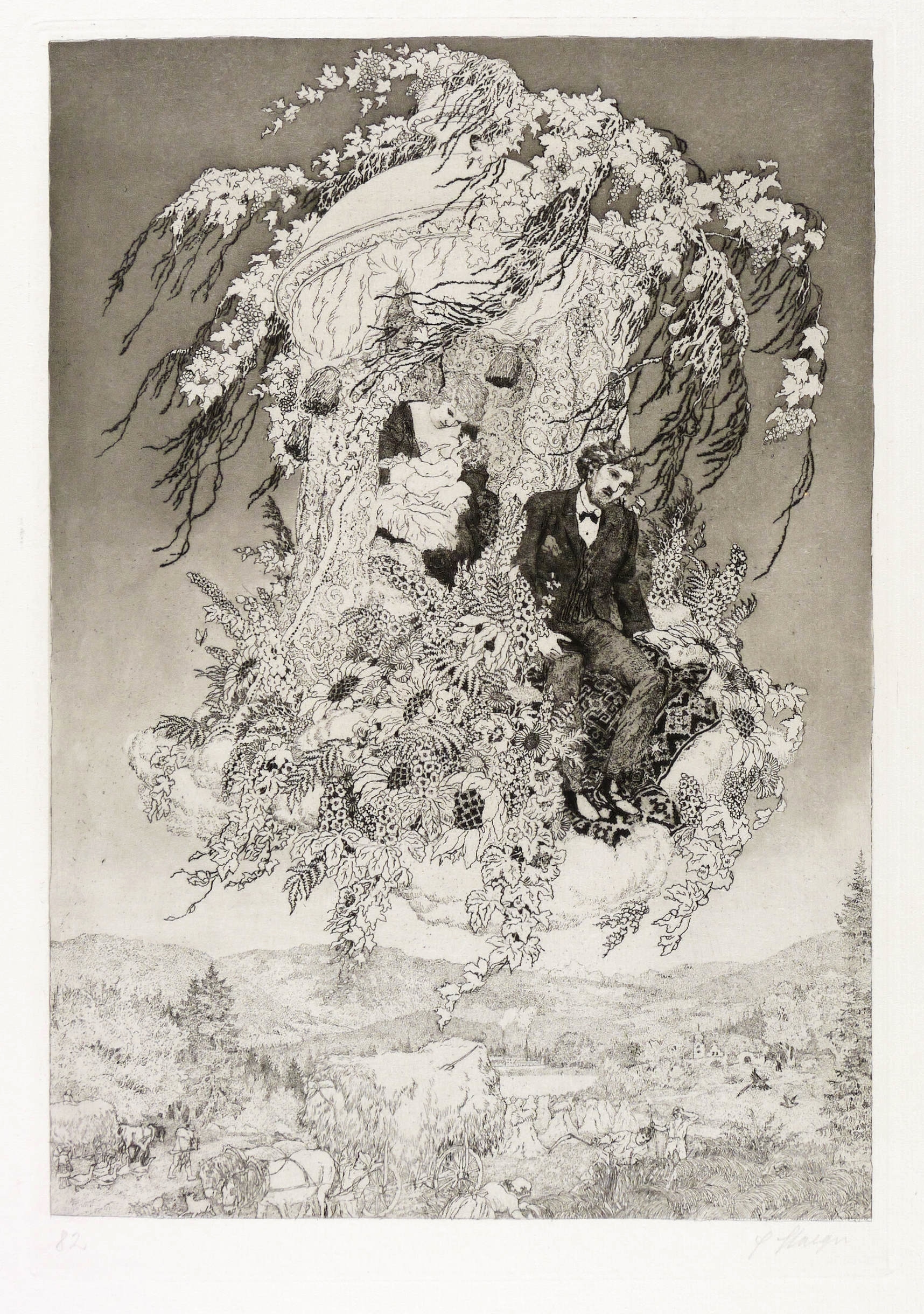 Muschler 118. – Rechts unten in Bleistift signiert: ″F Staeger″. Links Auflagenbezeichnung. Wasserzeichen. – In einer von Blüten und Rankenpflanzen überwucherten Wolke mit Zelt eine junge Frau, ein Kind stillend, und der junge Dichter mit Buch, die Welt in Gestalt einer Landschaft überfliegend, mit Kornernte, kleinem Schloss und einer Fabrik am See. – Originalrandiges Exemplar. Tadellos erhalten. Hervorragender Zustand.