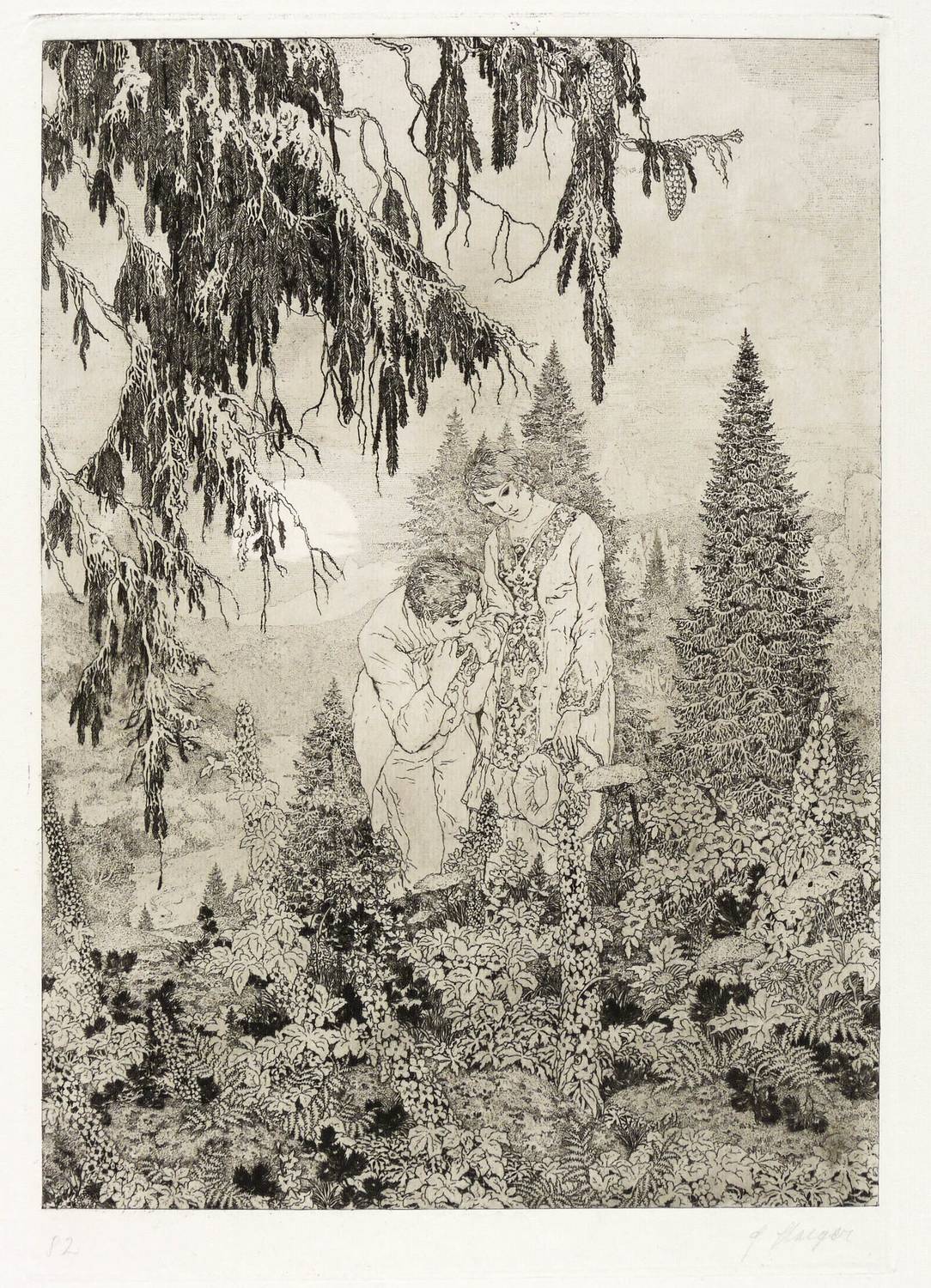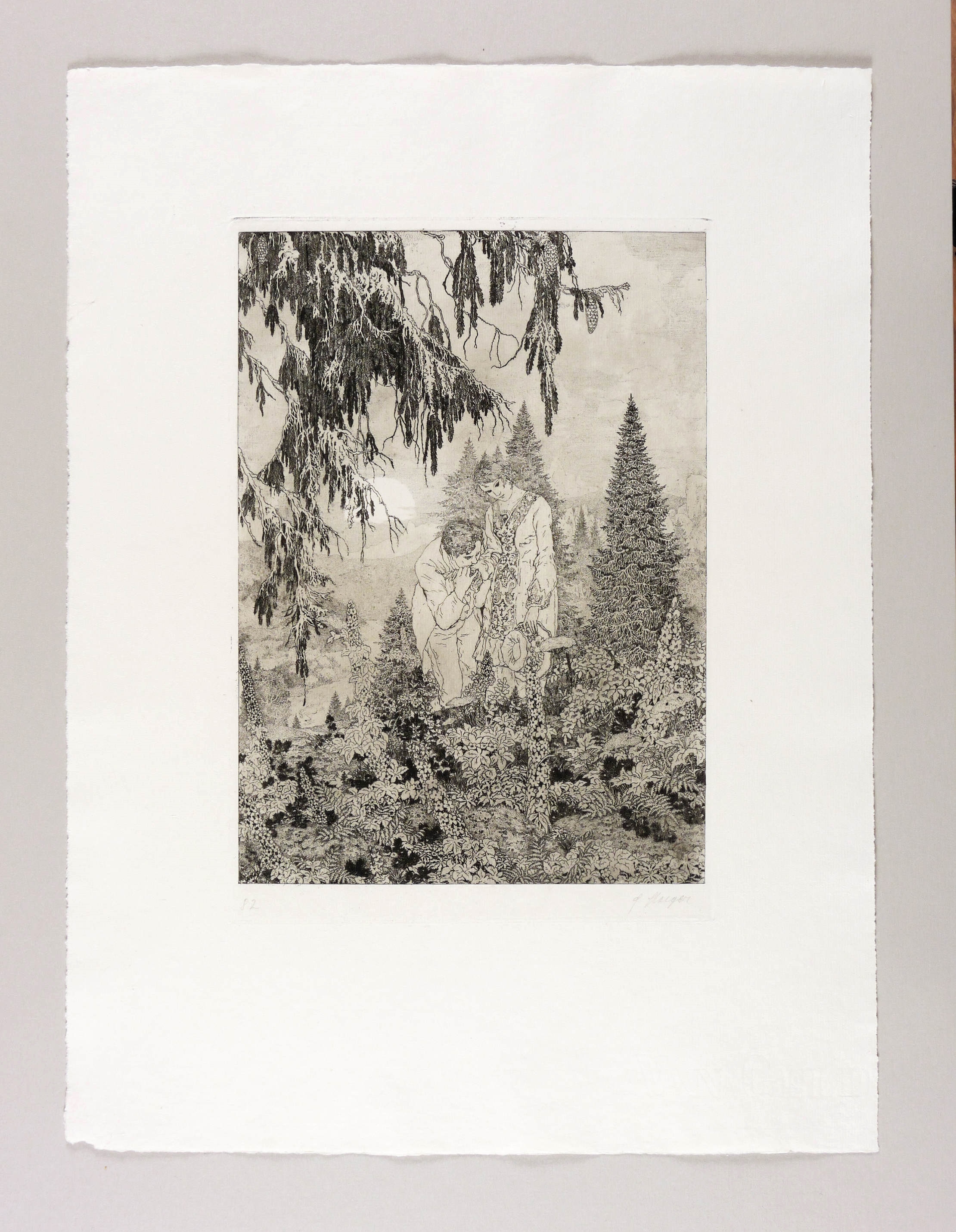 Muschler 117. – Rechts unten in Bleistift signiert: ″F Staeger″. Links Auflagenbezeichnung. Wasserzeichen. – Auf einer Waldesanhöhe ein mit geneigtem Kopf stehendes Mädchen, dessen rechten Unterarm ein vor ihr kniender junger Mann hält und herzt. – Originalrandiges Exemplar. Tadellos erhalten. Hervorragender Zustand.