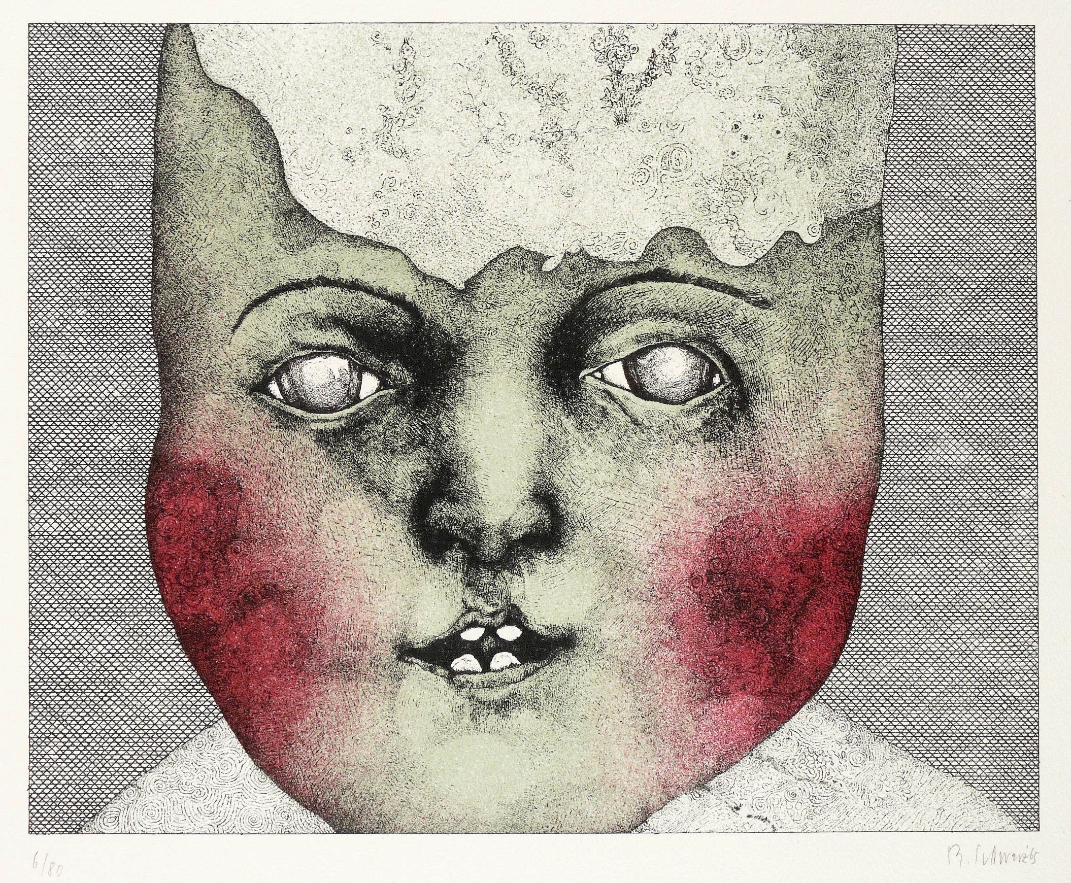 Aus: Reiner Schwarz, Phantastische Physiognomien. Sieben Lithographien (Hildesheim: Verlag Schrift und Bild 1965). – In Bleistift rechts unten signiert und datiert: ″R. Schwarz '65″. Links Auflagenbezeichnung. – Tadellos erhalten. Sehr guter Zustand.
