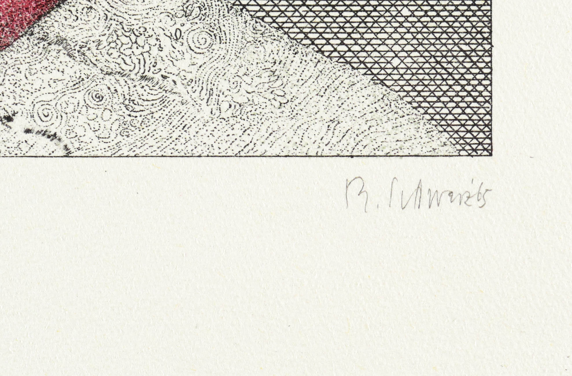 1965. Farblithografie / Feder- & Pinsellithografie, in Graugrün, Karminrot & Schwarz, auf hellchamois Velin. – Originale Künstlergrafik, von Reiner Schwarz. – Auflage Exemplar Nr. 6/80. – 24,2 x 30,0 cm (Darstellung / Druckbild), 52 x 38 cm (Blatt).