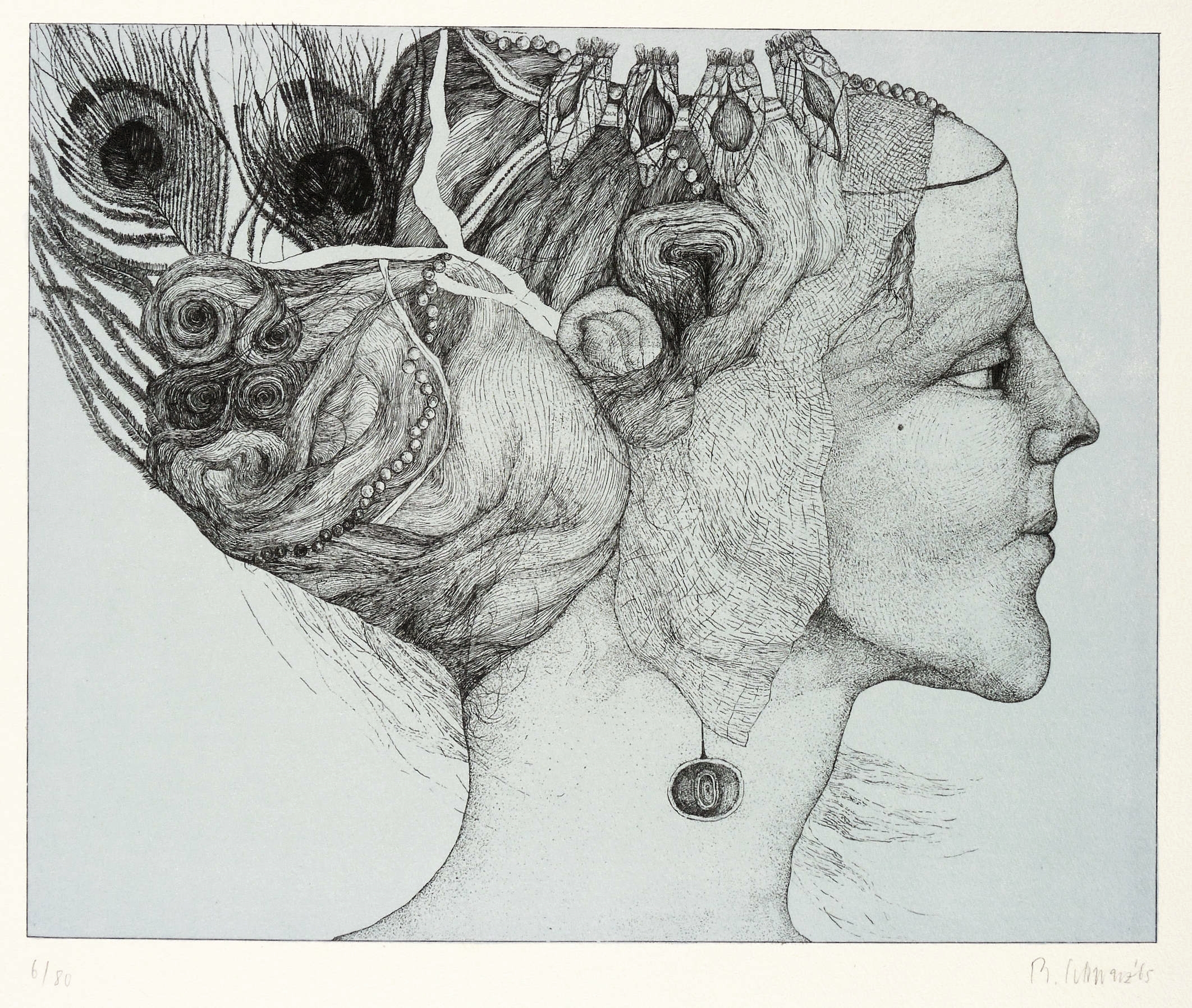 1965. Farblithografie / Feder- & Pinsellithografie, in Blaugrau & Schwarz, auf hartem hellchamois Velin. – Originale Künstlergrafik, von Reiner Schwarz. – Auflage Exemplar Nr. 6/80. – 24,2 x 30,0 cm (Darstellung / Druckbild), 52 x 38 cm (Blatt).
