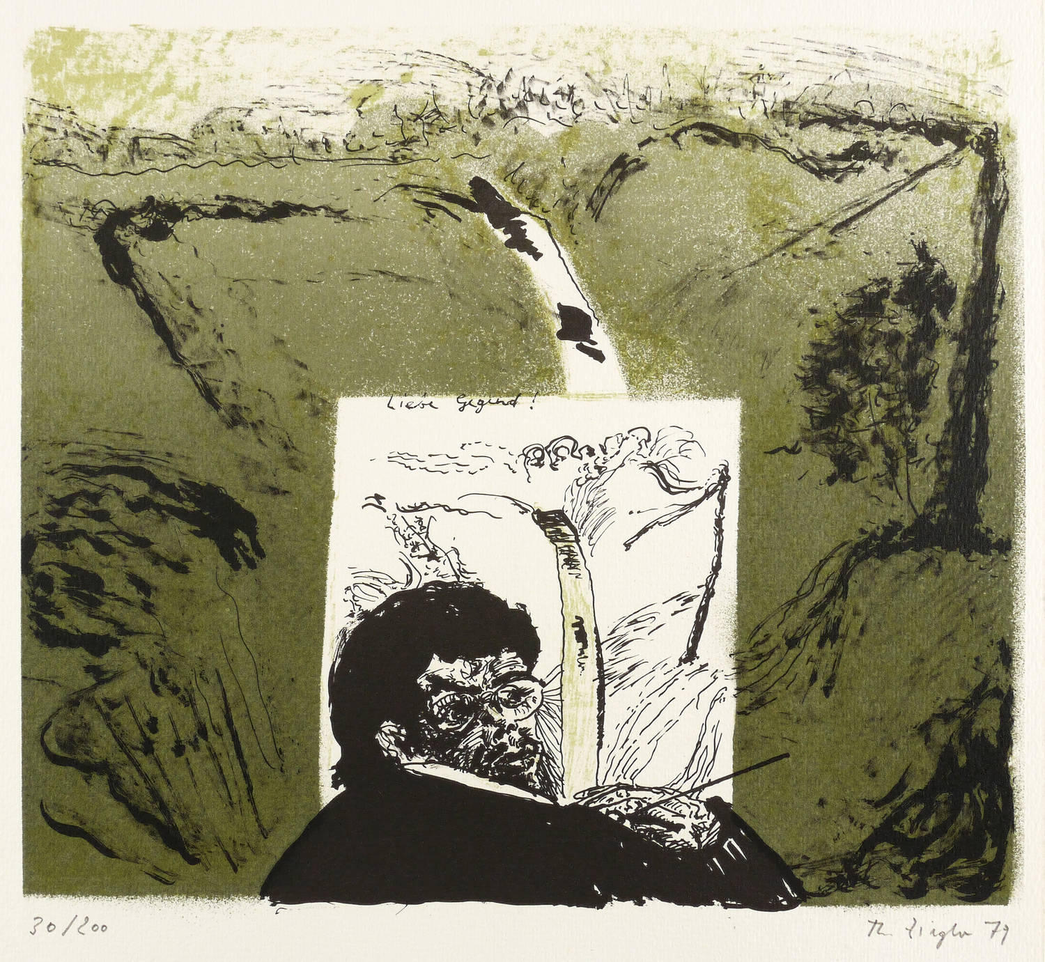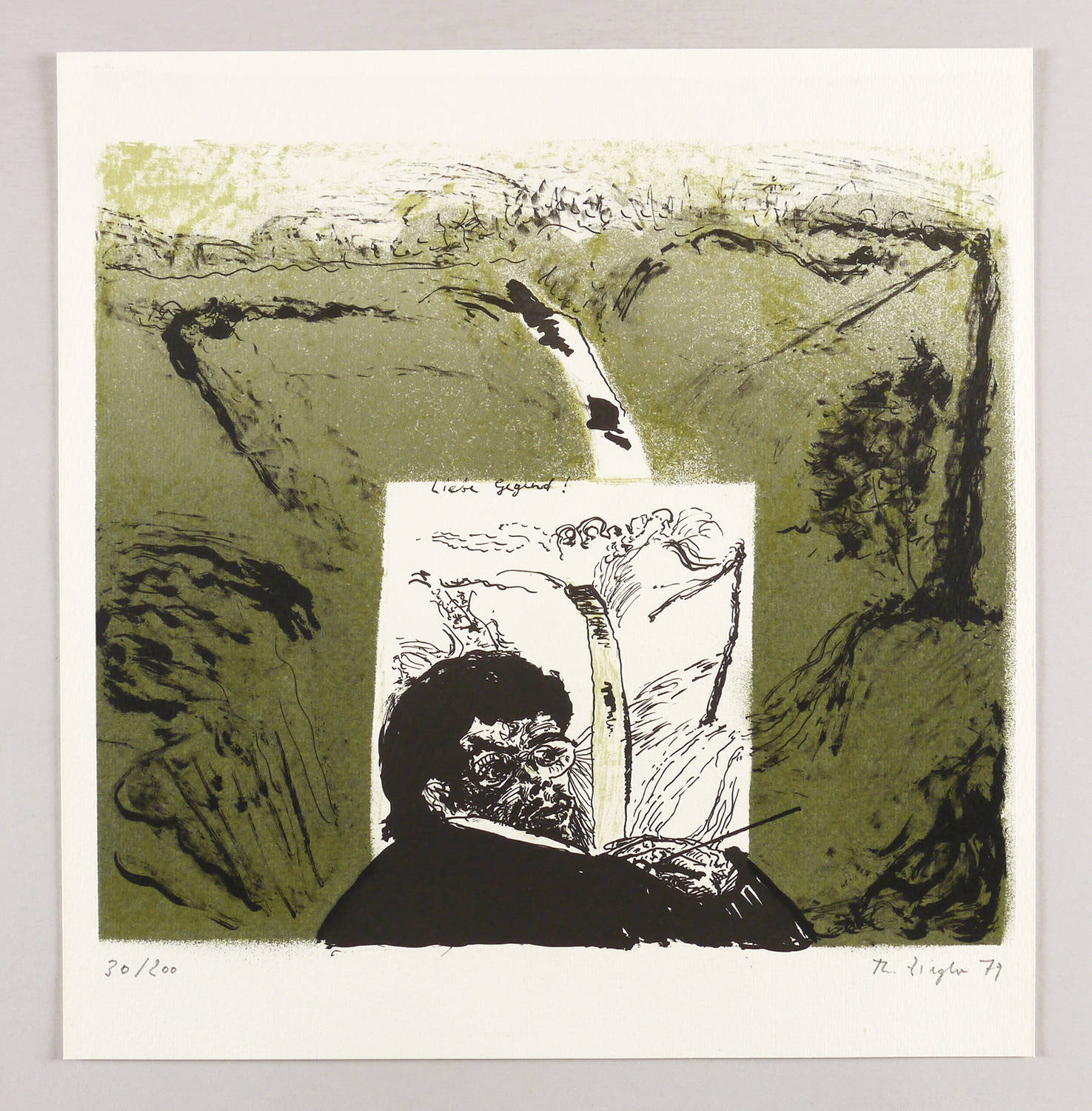 1979. Farboffsetlithografie / Feder- & Pinsellithografie, in Grün & Schwarz, auf hellchamois Maschinenkarton. – Originale Künstlergrafik, von Thomas Ziegler. – Auflage Exemplar Nr. 30/200. – 29,5 x 33,2 cm (Darstellung / Druckbild), 37 x 35 cm (Blatt).