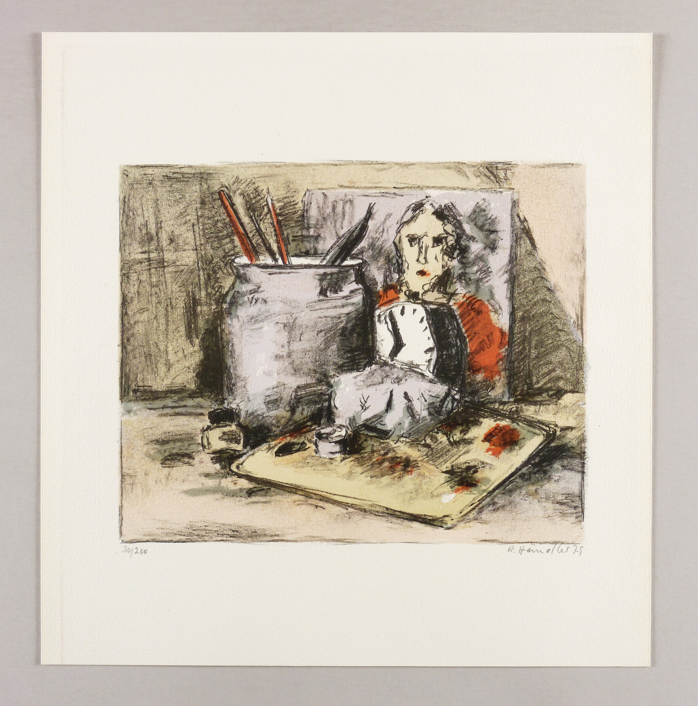 1979. Farboffsetlithografie / Kreide- & Pinsellithografie, in 5 Farben, auf hellem Maschinenkarton. – Originale Künstlergrafik, von Rolf Händler. – Auflage Exemplar Nr. 30/200. – 22,1 x 27,0 cm (Darstellung / Druckbild), 37 x 35 cm (Blatt).