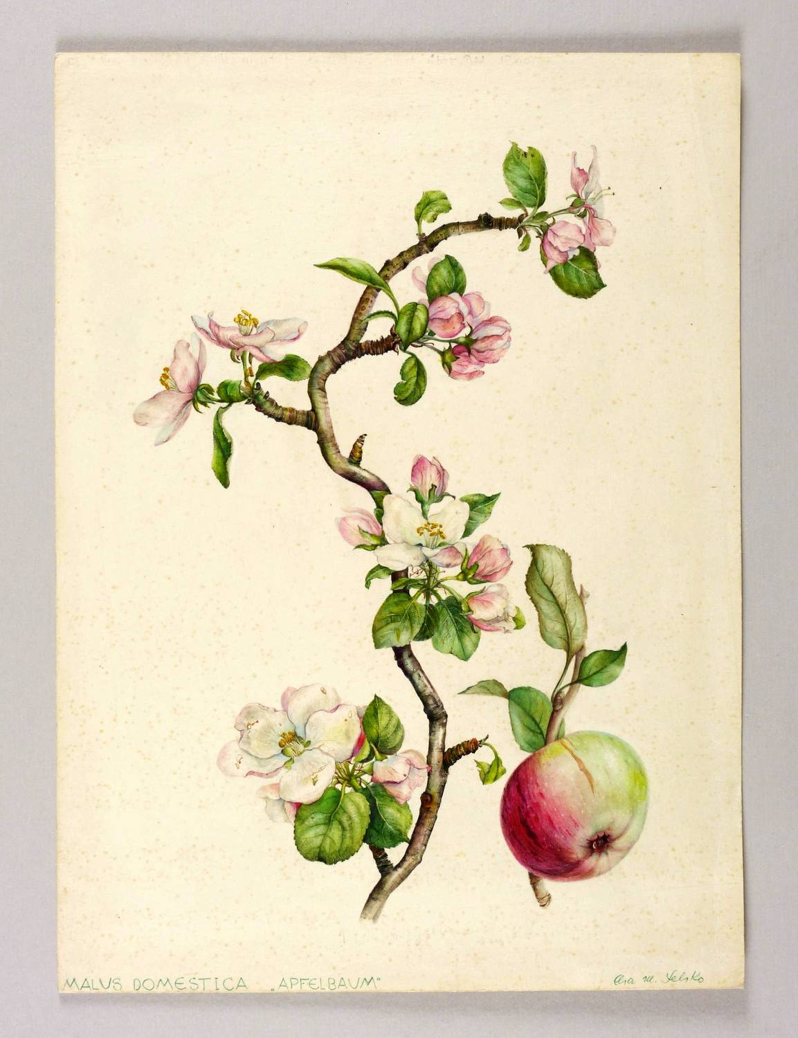 Rechts unten in Kugelschreiber signiert: ″Elsa M. Felsko″. Links unterhalb der Darstellung betitelt: ″MALUS DOMSTICA 'APFELBAUM''″. Verso in Bleistift Jahr. – Botanisches Aquarell von allerhöchster zeichnerischer wie koloristischer Qualität. Sehr schönes Blatt der Künstlerin. – Papier durchgehend gering fleckig. Blattränder rückseitig mit Rahmungsspuren.