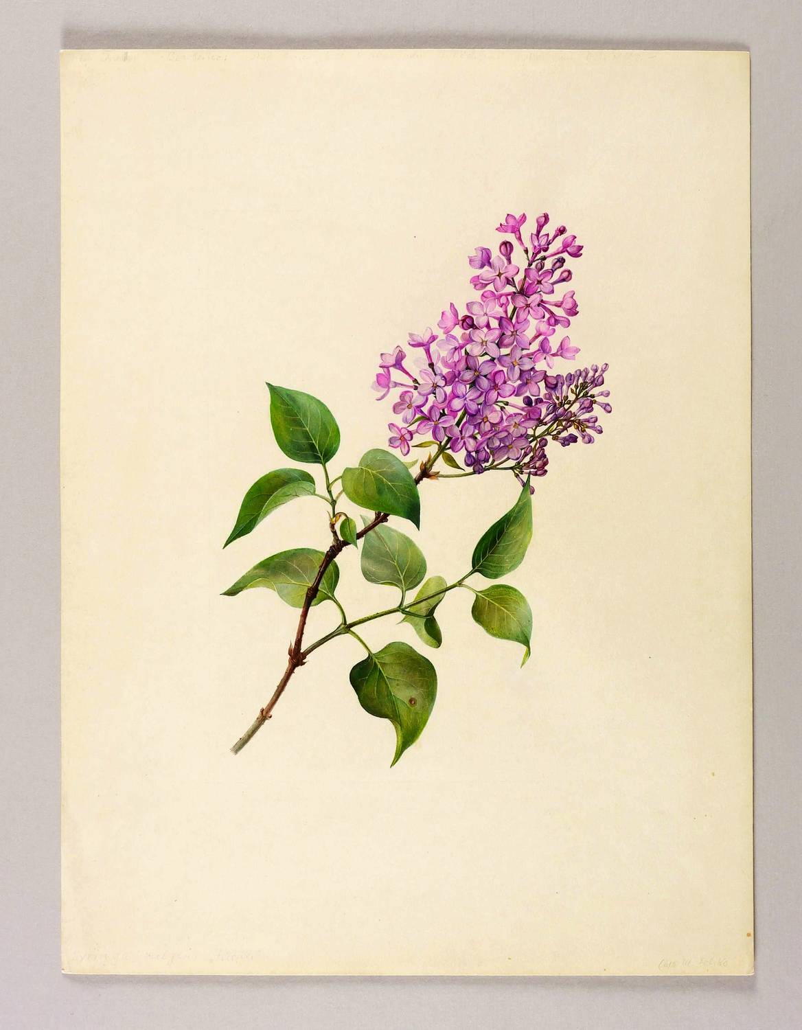 In der Blattecke rechts unten in Bleistift signiert: ″Elsa M. Felsko″. Links unten in der Blattecke betitelt: ″Syringa vulagris / Flieder″. Verso nochmals bezeichnet. – Botanisches Aquarell von allerhöchster zeichnerischer wie koloristischer Qualität. – Nahezu makellos. Schöne Farbfrische. Sehr guter Erhaltungszustand.