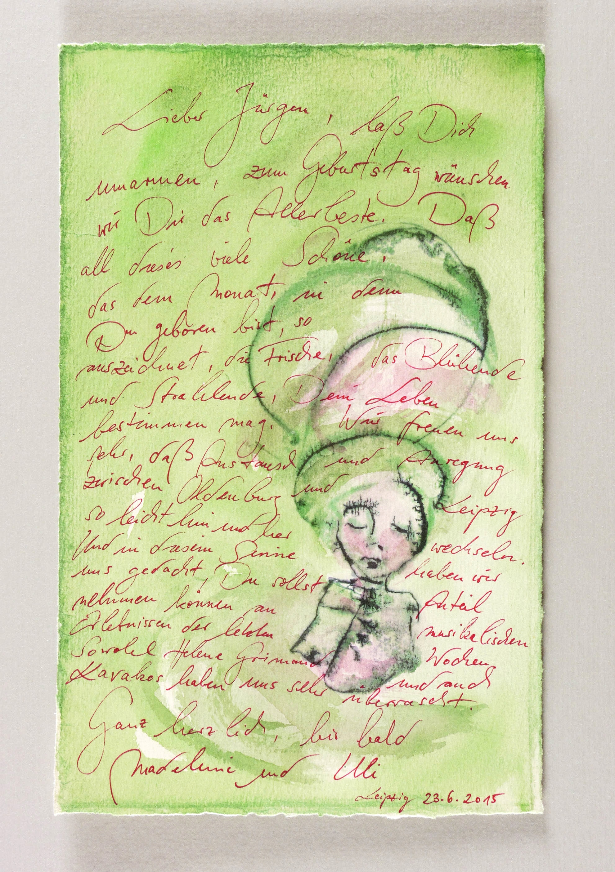 In rotem Faserstift Brief vom 23.6.2015 an Jürgen Steinfeld in Oldenburg: ″Lieber Jürgen, laß Dich umarmen, zum Geburtstag wünschen wir Dir das Allerbeste. Daß all dieses viele Schöne, das dem Monat, in dem Du geboren bist, so auszeichnet, die Frische, das Blühende und Strahlende, Dein Lebven bestimmen mag. Wir freuen uns sehr, daß Austausch und Anregung zwischen Oldenburg und Leipzig so leicht hin und her wechseln. Und in diesem Sinne haben wir uns gedacht, Du sollst Anteil nehmen können an musikalischen Erlebnissen der letzten Wochen. Sowohl Helen Grimaud und auch Kavaker haben uns sehr überrascht. ganz herzlich, bis bald / Madeleine und Uli / Leipzig, 23.6.2015″. – Sehr guter Zustand.