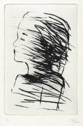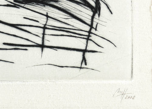 2008. Radierung / Kaltnadel, in Schwarz, auf rauem hellchamois Velin. – Von Madeleine Heublein. – Auflage Exemplar Nr. 9/30. – 14,8 x 9,7 cm (Darstellung / Platte), 18 x 12 cm (Blatt).