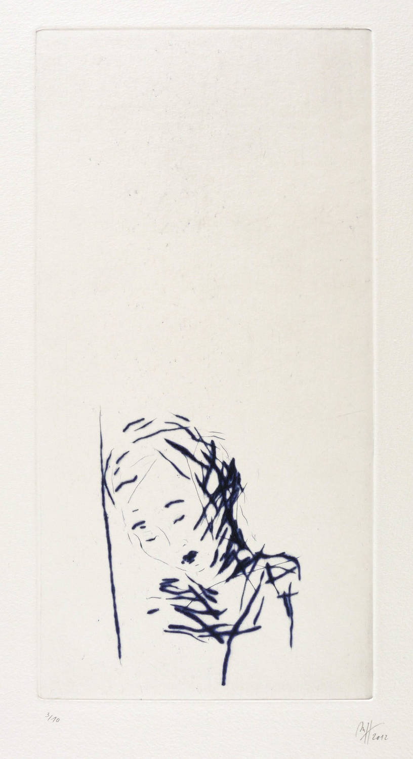 2012. Radierung / Kaltnadel, in Dunkelblau, auf schwerem hellchamois Velin. – Von Madeleine Heublein. – Auflage Exemplar Nr. 3/10. – 29,5 x 14,8 cm (Darstellung / Platte), 44 x 27 cm (Blatt).