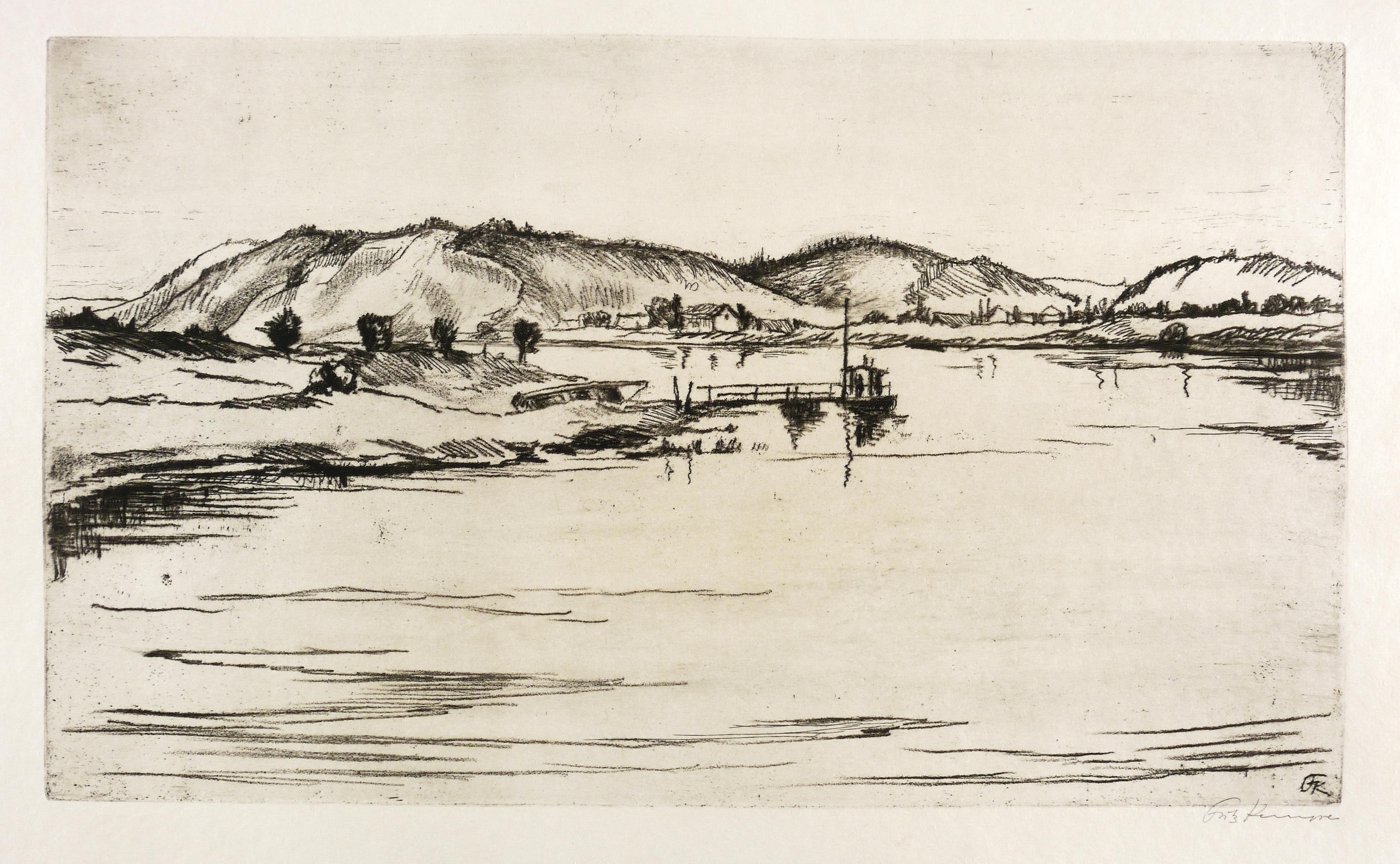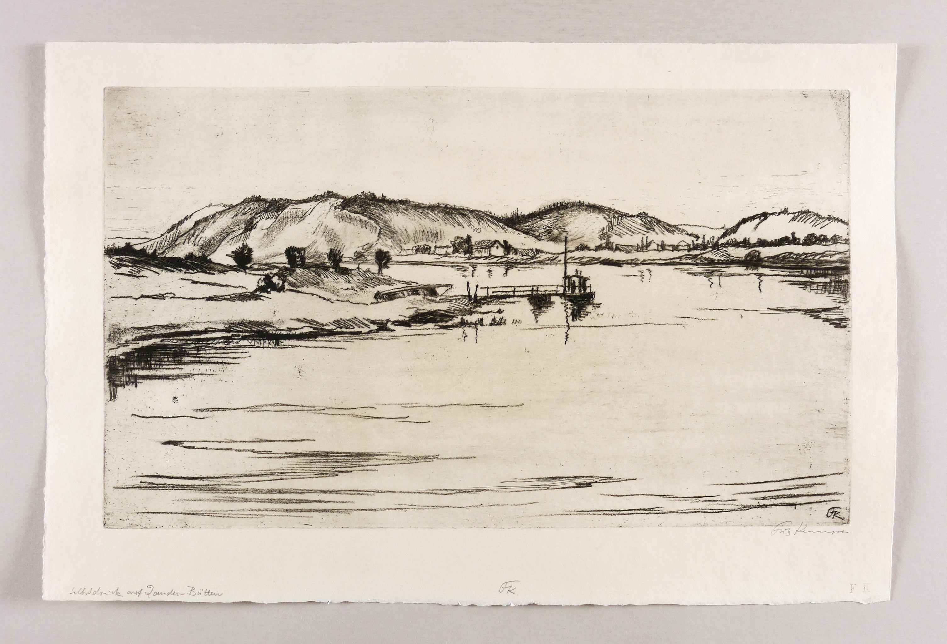 1952-1959. Radierung / Vernis mou, in Schwarz, auf feinem gelblichem Holland-Bütten. – Originale Künstlergrafik, von Fritz Kempe. – 25,3 x 42,5 cm (Darstellung / Platte), 32 x 49 cm (Blatt).
