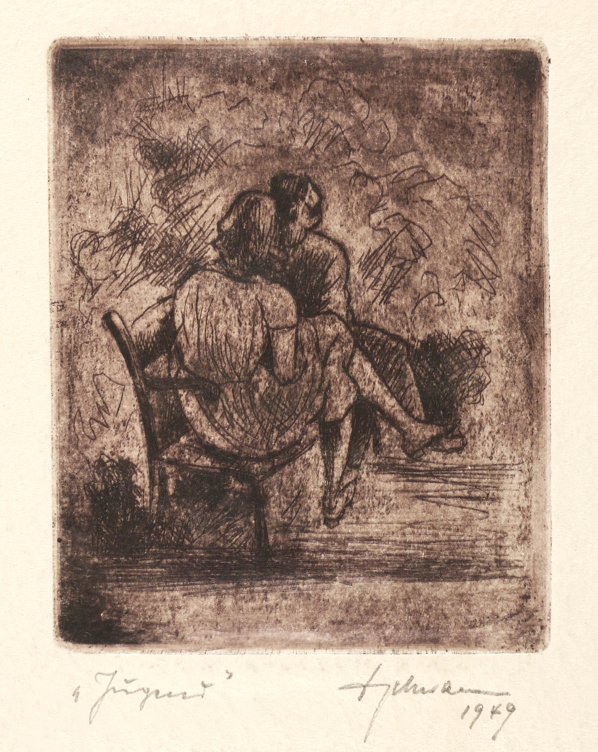 1949. Radierung / Vernis mou & Kaltnadel, in Schwarzviolett, auf gelbem Velinkarton. – Originale Künstlergrafik, von Wilhelm Engelmann. – 14,9 x 12,0 cm (Darstellung / Platte), 22 x 18 cm (Blatt).