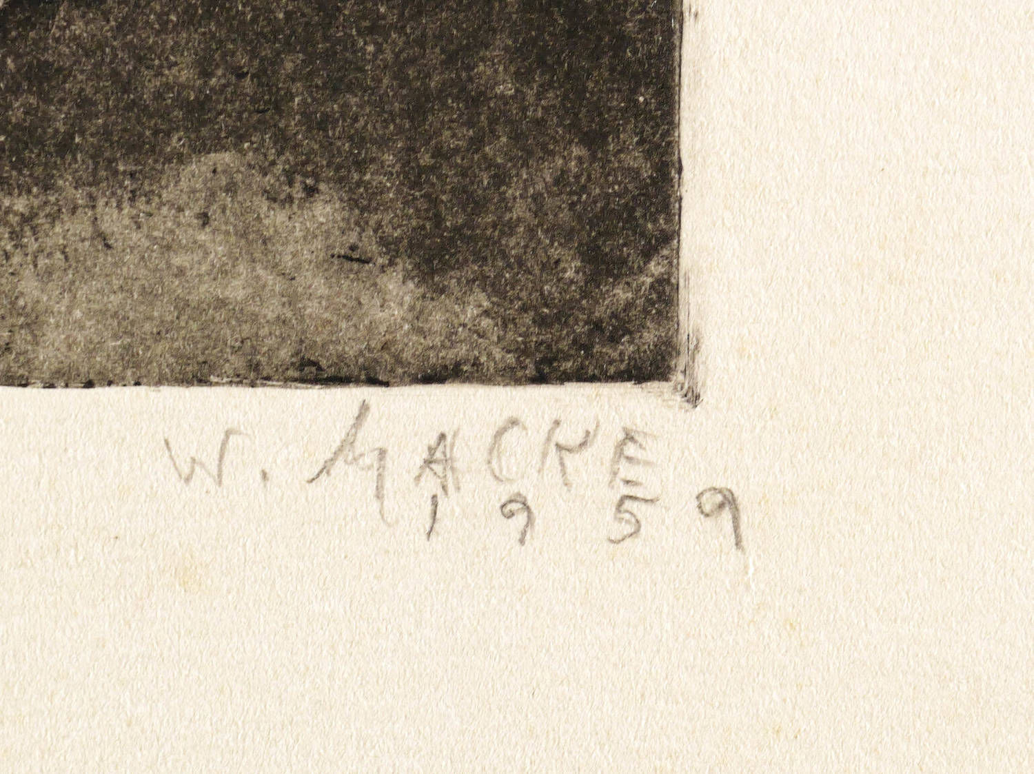 1959. Radierung / Strichätzung & Aquatinta, in Schwarz, ohne Plattenton, auf weißem Velin. – Originale Künstlergrafik, von Waltraute Macke-Brüggemann. – Probedruck. – 15,7 x 23,2 cm (Darstellung / Platte), 23 x 32 cm (Blatt).