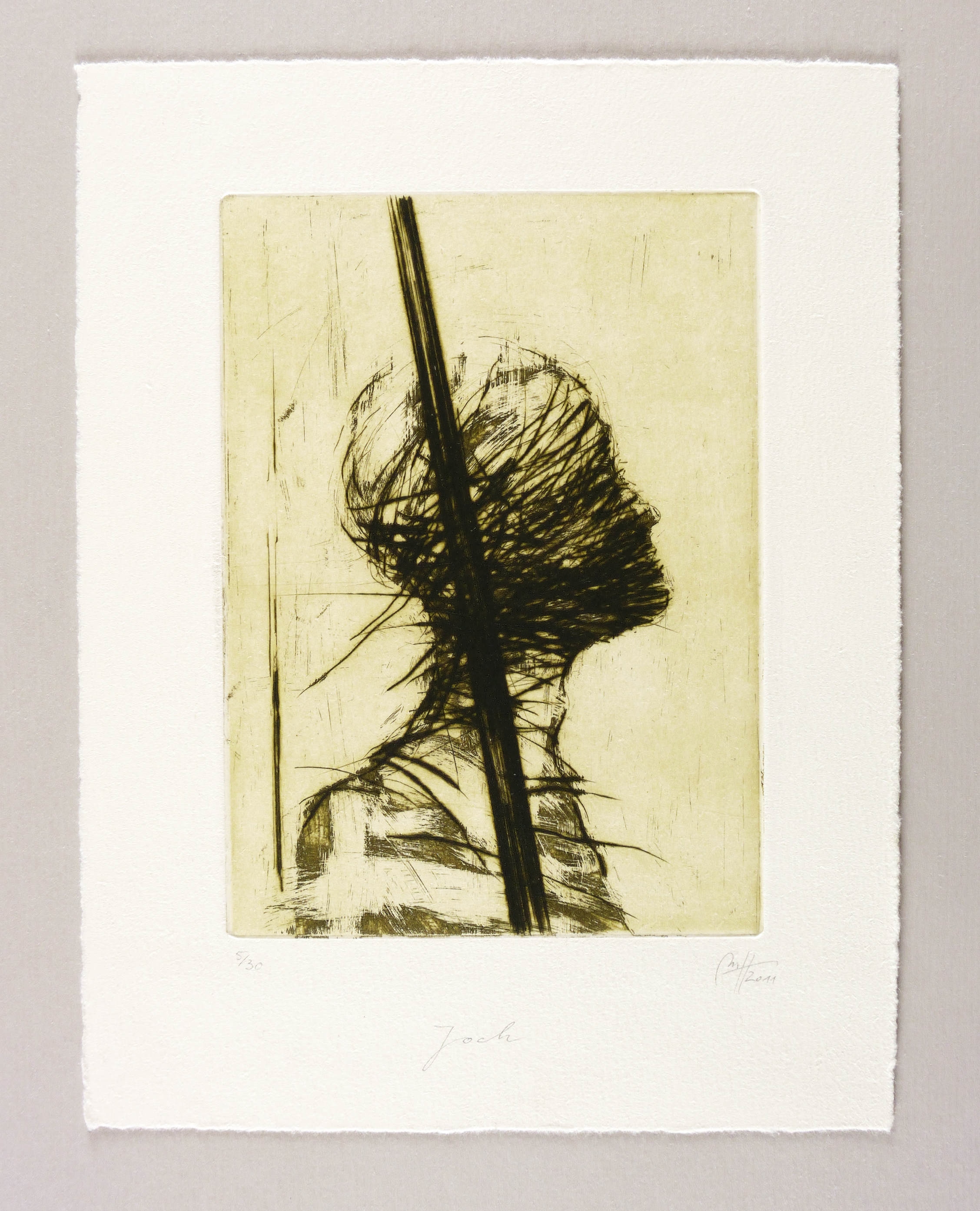 2011. Radierung / Aquatinta & Kaltnadel, geschabt, in Schwarzgrün, mit Plattenton, auf chamois Velin. – Von Madeleine Heublein. – Auflage Exemplar Nr. 5/30. – 17,8 x 12,9 cm (Darstellung / Platte), 26 x 20 cm (Blatt).