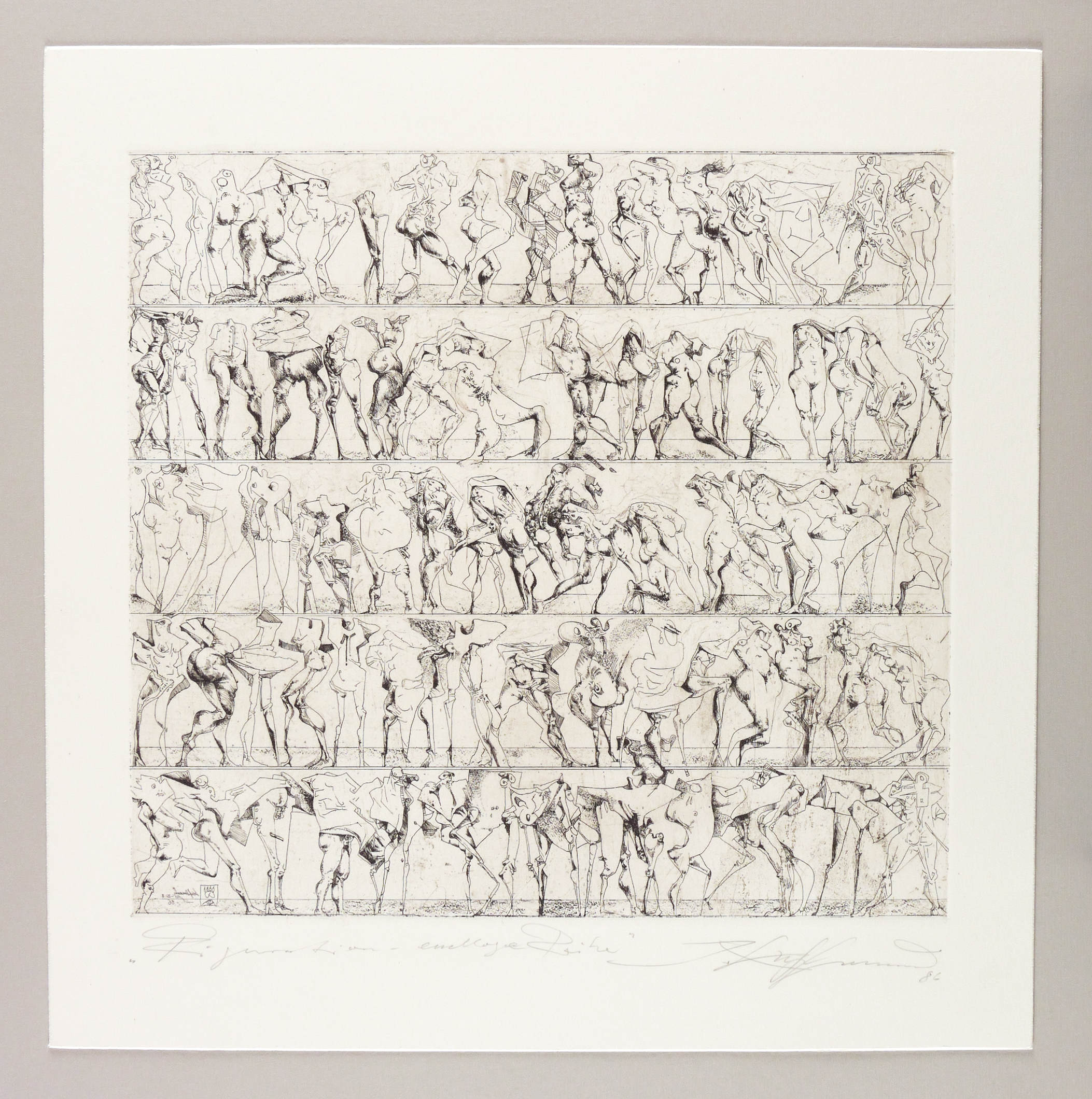 Rechts unten in Bleistift signiert und datiert: ″J. Kuhlmann 86″. Links eigenhändig bezeichnet: ″Figuration - endlose Reihe″. – Sehr guter Zustand.