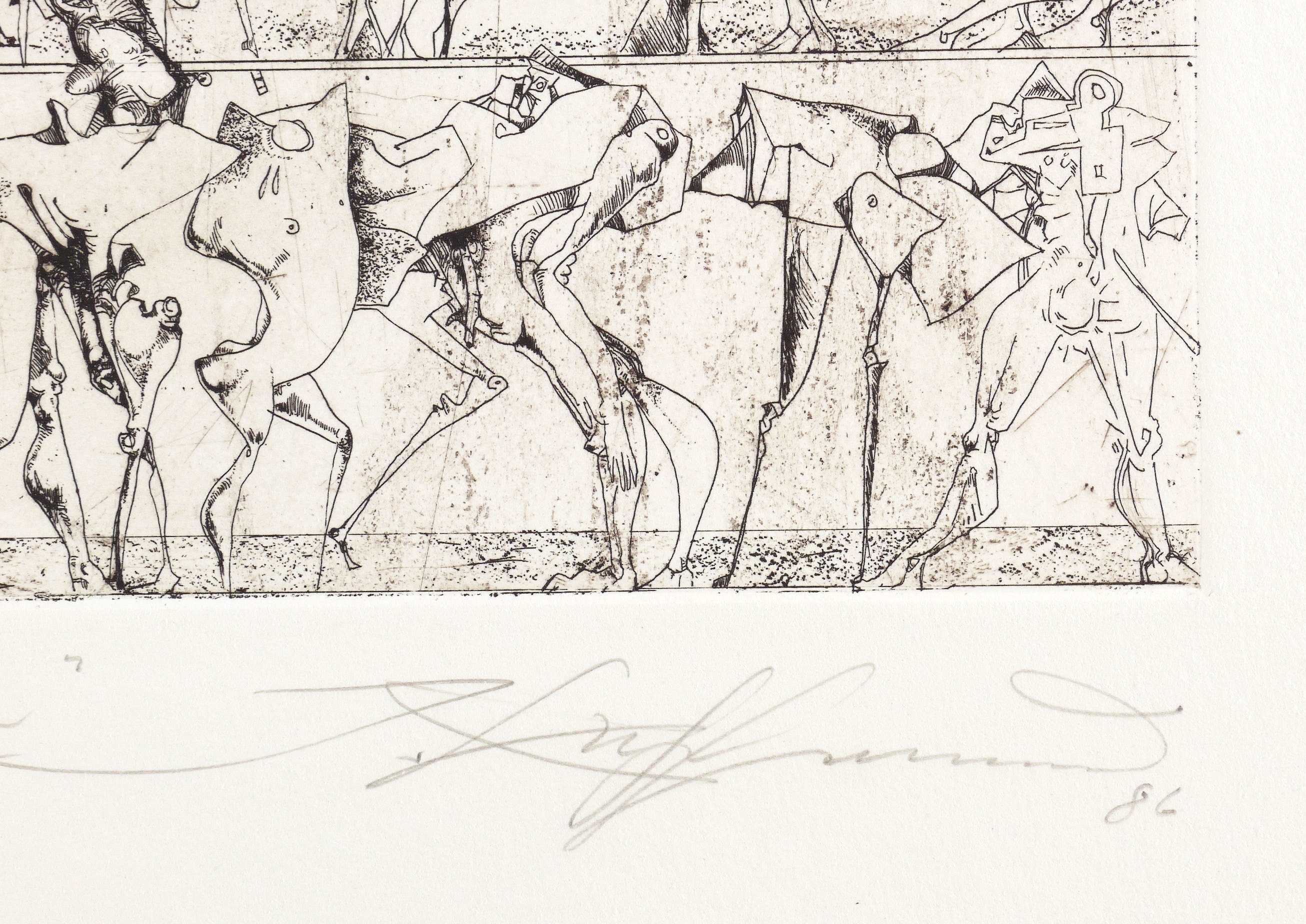 1986. Radierung / Strichätzung, in Schwarz, mit leichtem Plattenton, auf hellem Velinkarton. – Von Joachim Kuhlmann. – Künstlerexemplar (e.a.). – 39,8 x 42,7 cm (Darstellung / Platte), 53 x 52 cm (Blatt).