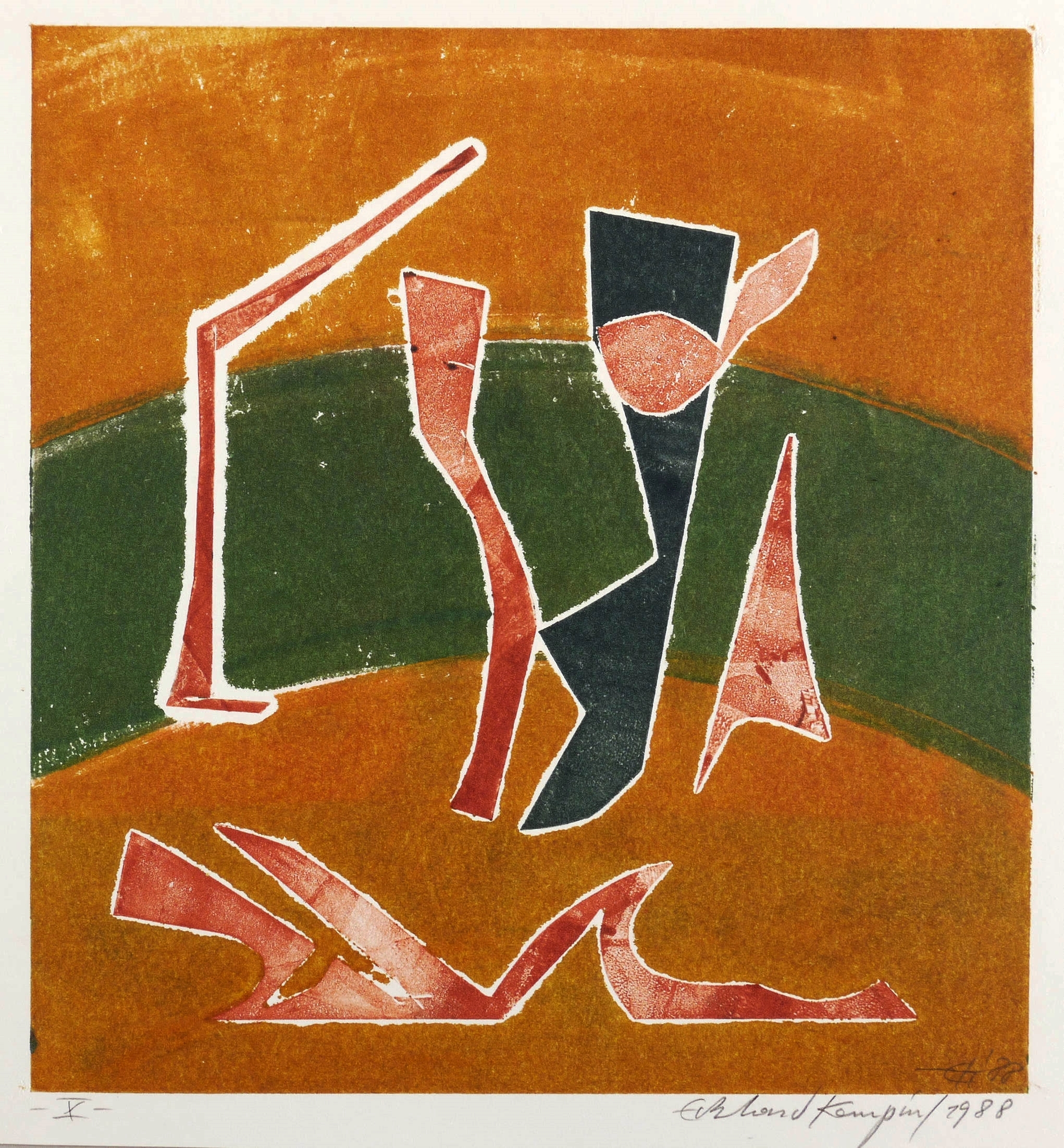 1988. Farbmonotypie, in 4 Farben, auf leichtem weißem Maschinenpapier. – Originale Künstlergrafik, von Eckhard Kempin. – 18,7 x 17,3 cm (Darstellung), 22 x 21 cm (Blatt).