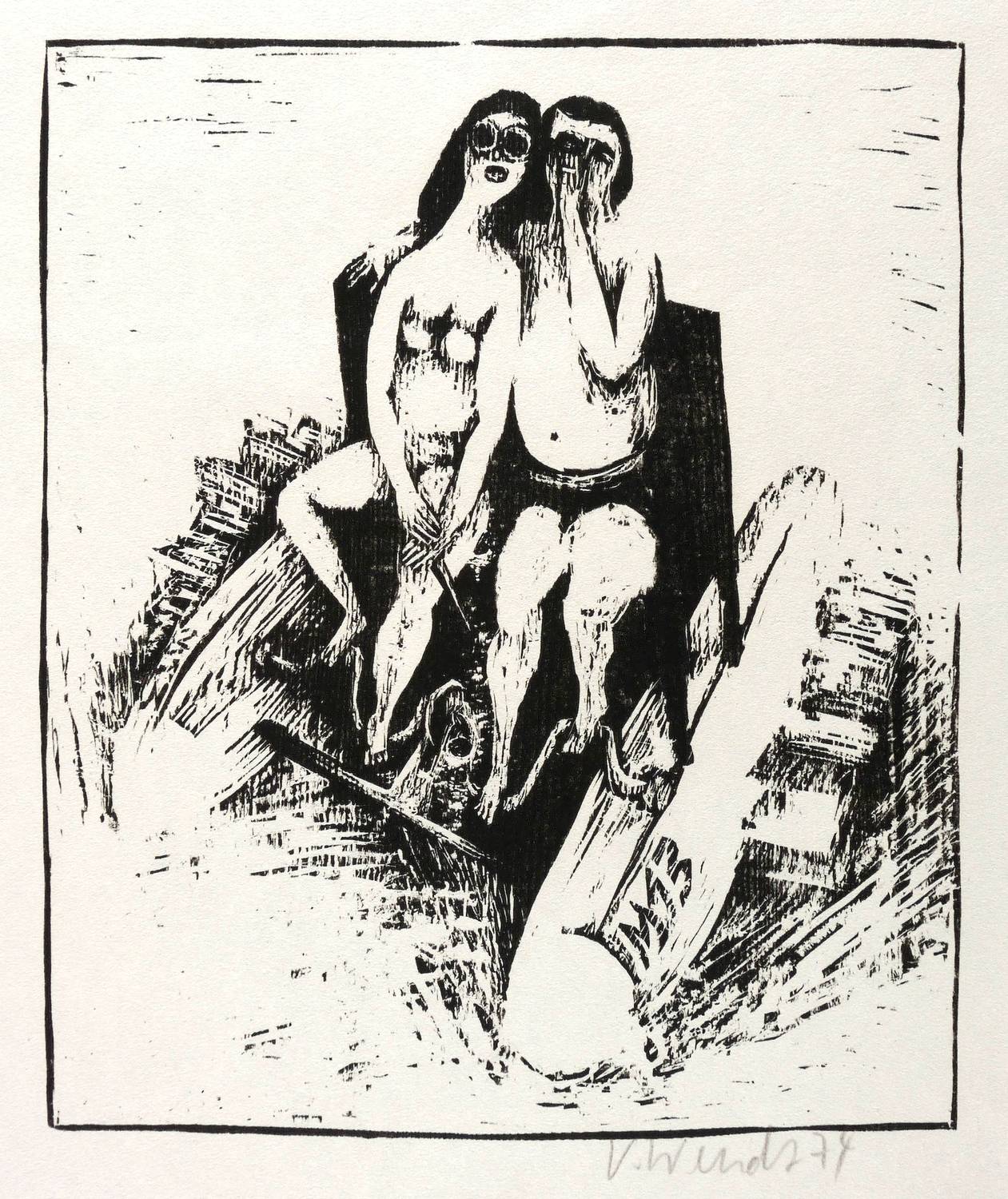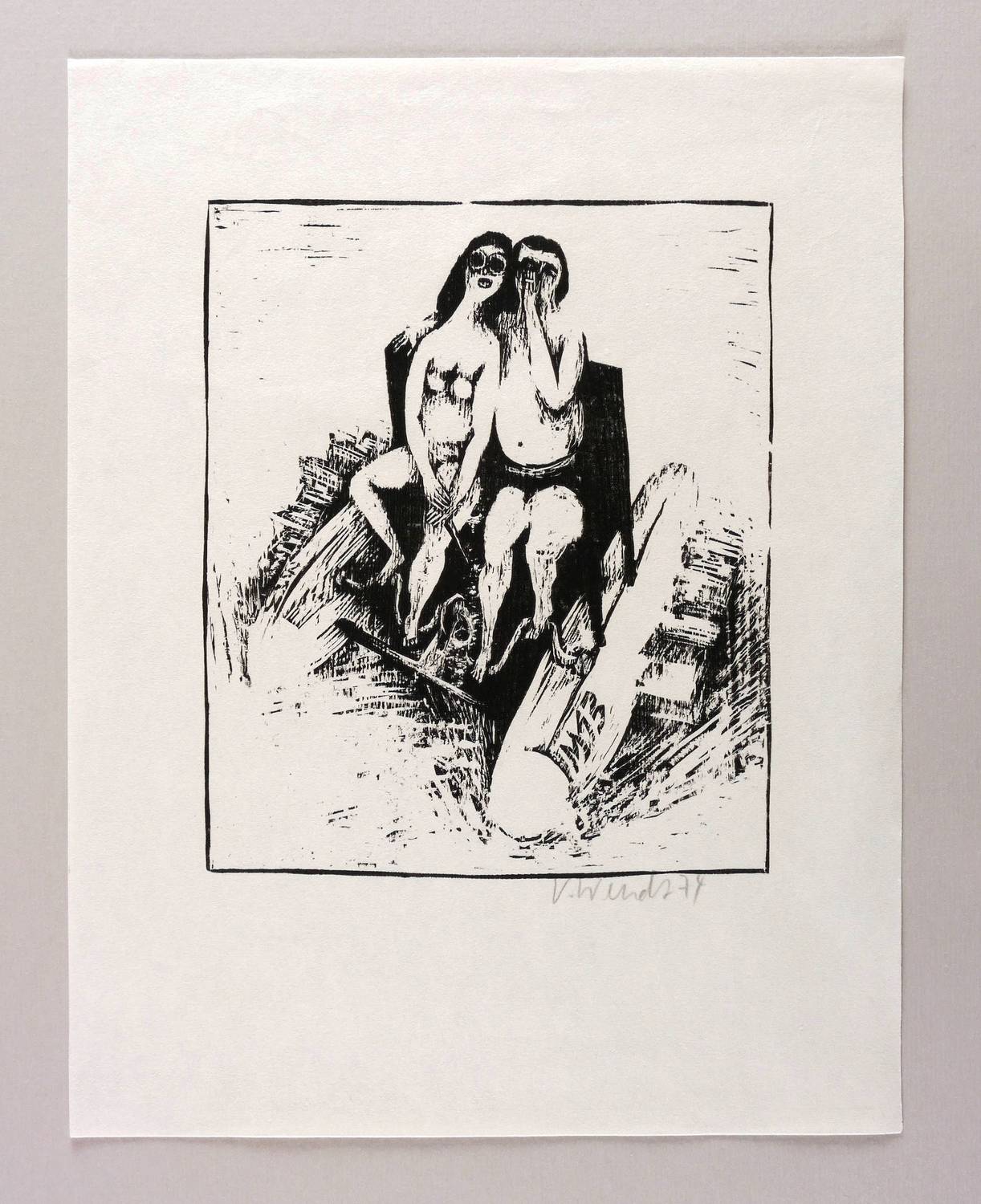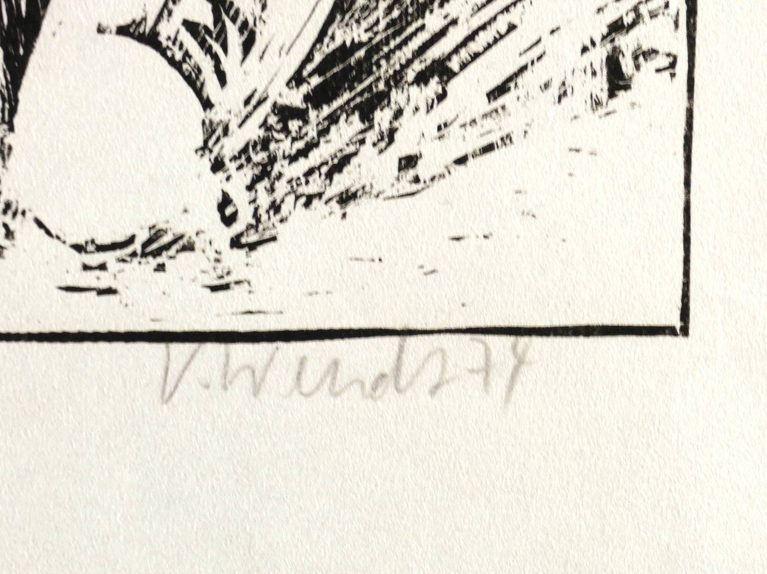 1974. Holzschnitt, in Schwarz, auf rauem weißlichem Similijapan. – Originale Künstlergrafik, von Volker Wendt. – 23,4 x 19,5 cm (Darstellung / Druckstock), 37 x 29 cm (Blatt).