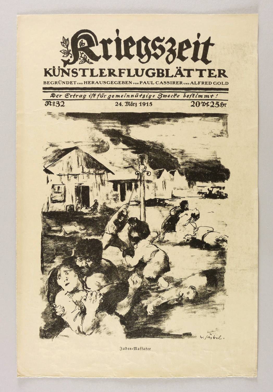Stilijanov-Nedo 61. – Aus: Kriegszeit. Künstlerflugblätter (Berlin: Paul Cassirer & Alfred Gold 1914-1916). – Nicht handsigniert. Im Stein signiert rechts unten: ″W. Jäckel″. Unterhalb typografisch Titel. – Rückseitig weitere Lithografie ″Der verwundete Kamerad″ von József Bato. – Im Rand leicht knickspurig. Oberflächlich geringfügiger Abklatsch von Druckerschwärze. Insgesamt mäßig guter Zustand.