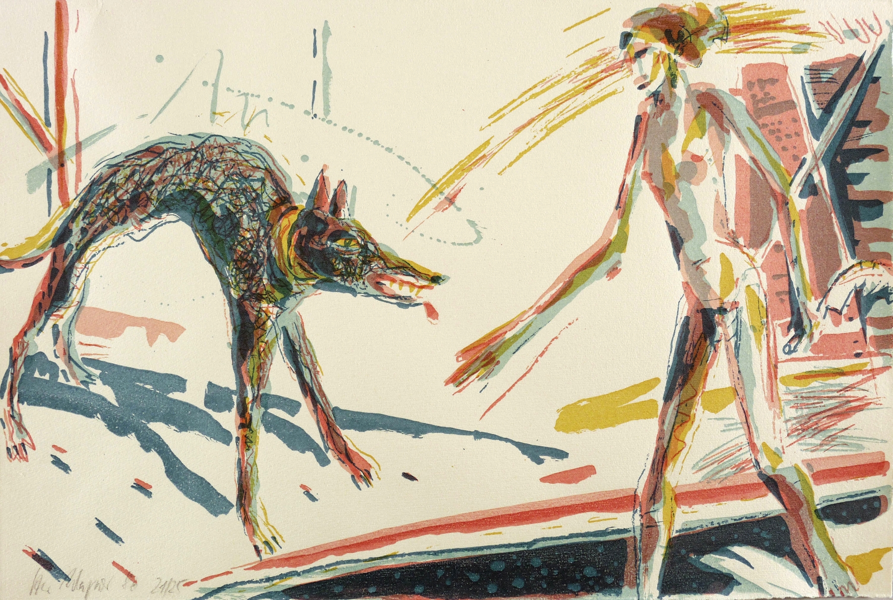 1988. Farblithografie / Pinsellithografie, in 5 Farben, auf hellgelbem Hahnemühle-Bütten. – Originale Künstlergrafik, von Stefan Thomas Wagner. – Auflage Exemplar Nr. 21/25. – 32,5 x 48,1 cm (Darstellung / Blatt).