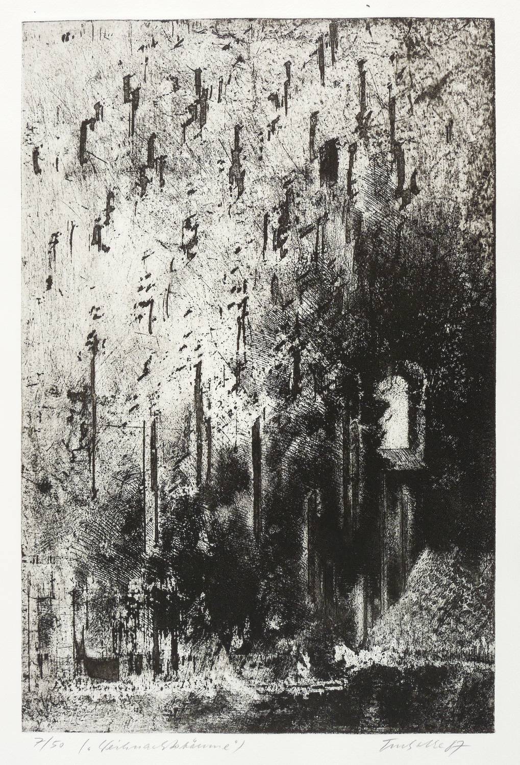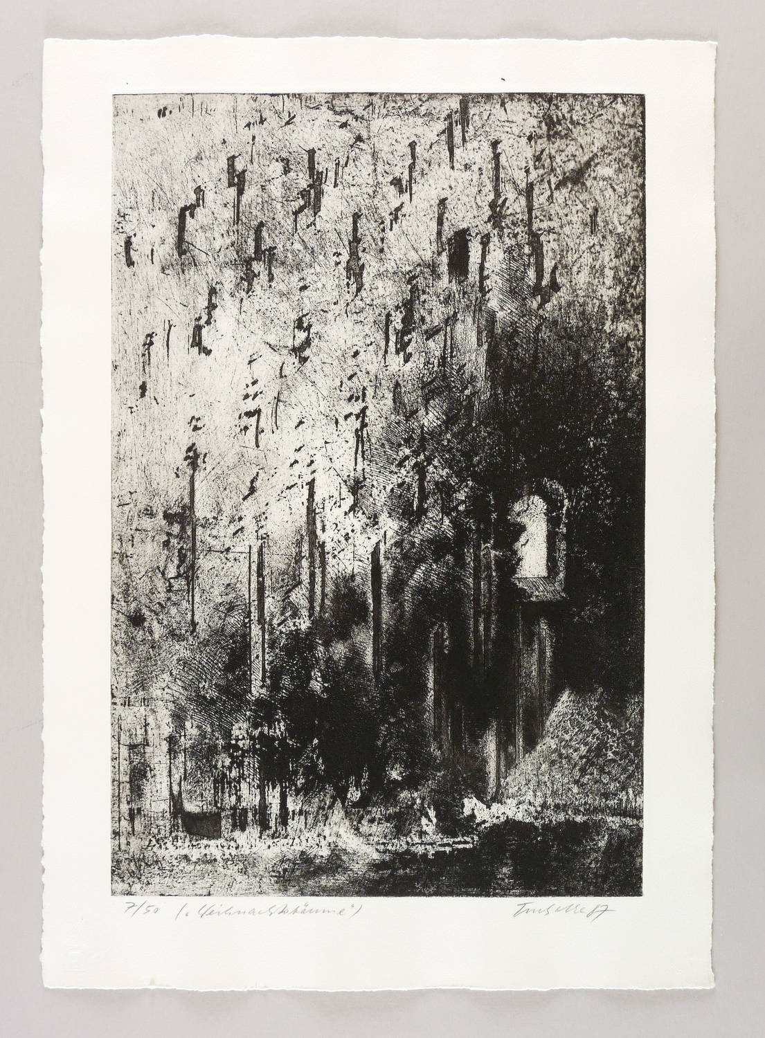 Aus: Dieter Tucholke, Die Nacht hat 12 Stunden. Ein Totentanz (Berlin: Staatlicher Kunsthandel der DDR 1987). – Rechts unten in Bleistift signiert und datiert: ″Tucholke 87″. Links Auflagenbezeichnung und Titel. Trockenstempel der Grafik-Edition. Wasserzeichen. – Tadellos erhalten. Sehr guter Zustand.