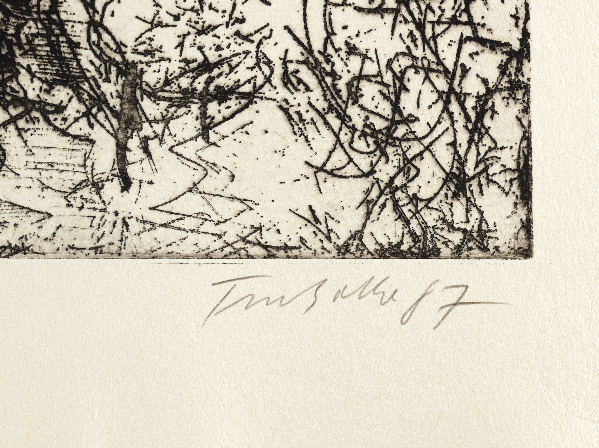 Aus: Dieter Tucholke, Die Nacht hat 12 Stunden. Ein Totentanz (Berlin: Staatlicher Kunsthandel der DDR 1987). – Rechts unten in Bleistift signiert und datiert: ″Tucholke 87″. Links Auflagenbezeichnung und Titel. Trockenstempel der Grafik-Edition. Wasserzeichen. – Tadellos erhalten. Sehr guter Zustand.