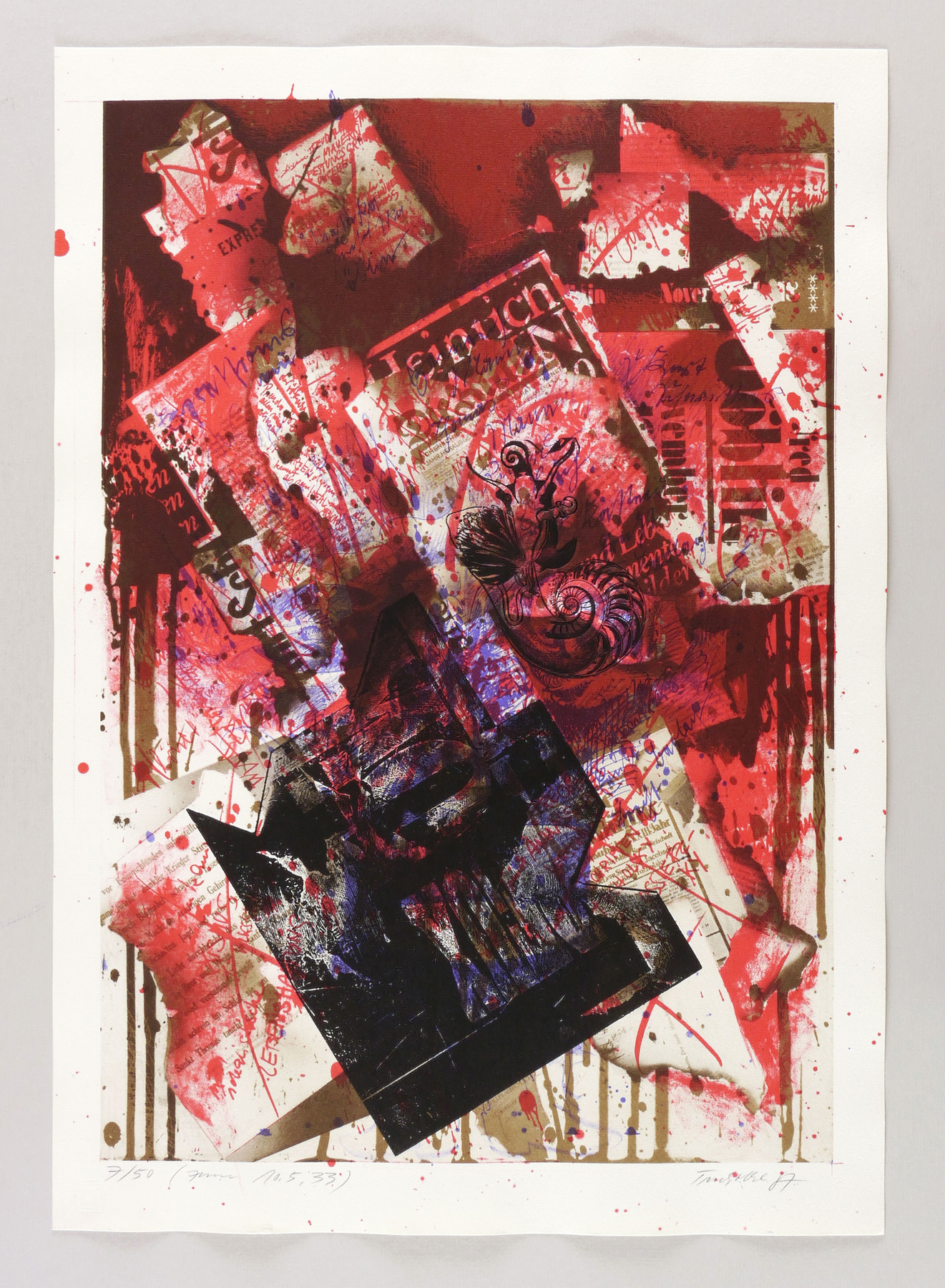 1987. Mischtechnik / Farbsiebdruck & Radierung, in Rot, Braun, Violett & Schwarz, auf weichem hellchamois Velin. – Originale Künstlergrafik, von Dieter Tucholke. – Auflage Exemplar Nr. 7/50. – 51,7 x 35,8 cm (Darstellung / Druckbild), 58 x 41 cm (Blatt).
