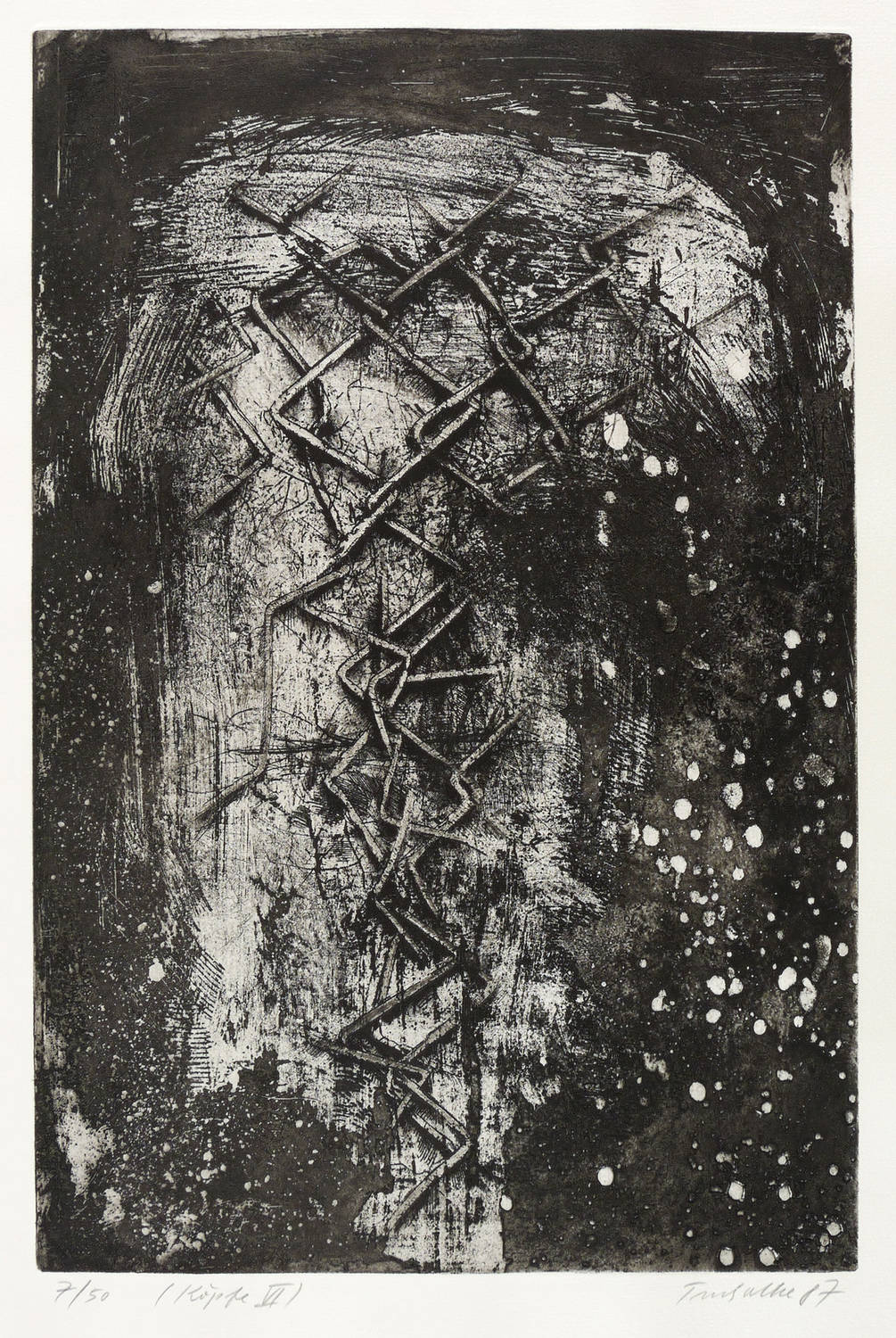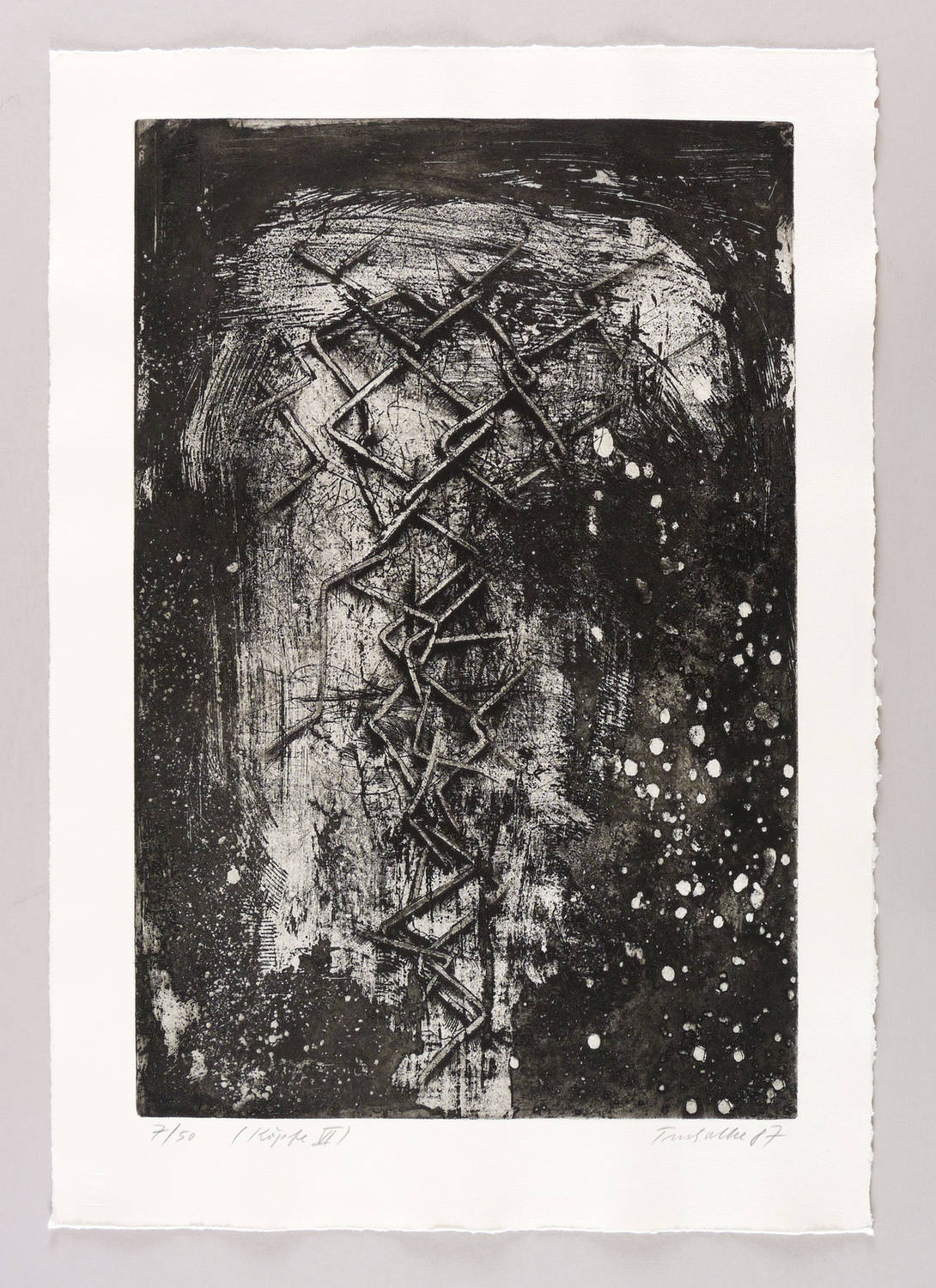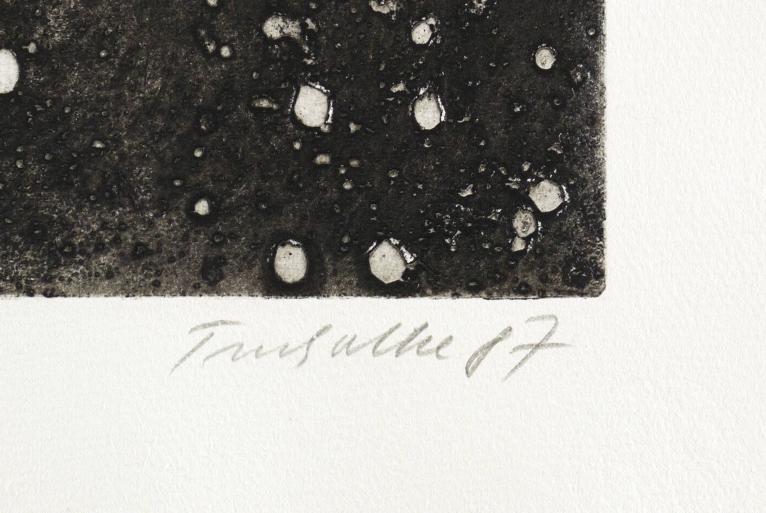 1987. Radierung / Reservage, geschabt, in Schwarz, auf schwerem Hahnemühle. – Originale Künstlergrafik, von Dieter Tucholke. – Auflage Exemplar Nr. 7/50. – 49,7 x 33,1 cm (Darstellung / Platte), 59 x 41 cm (Blatt).