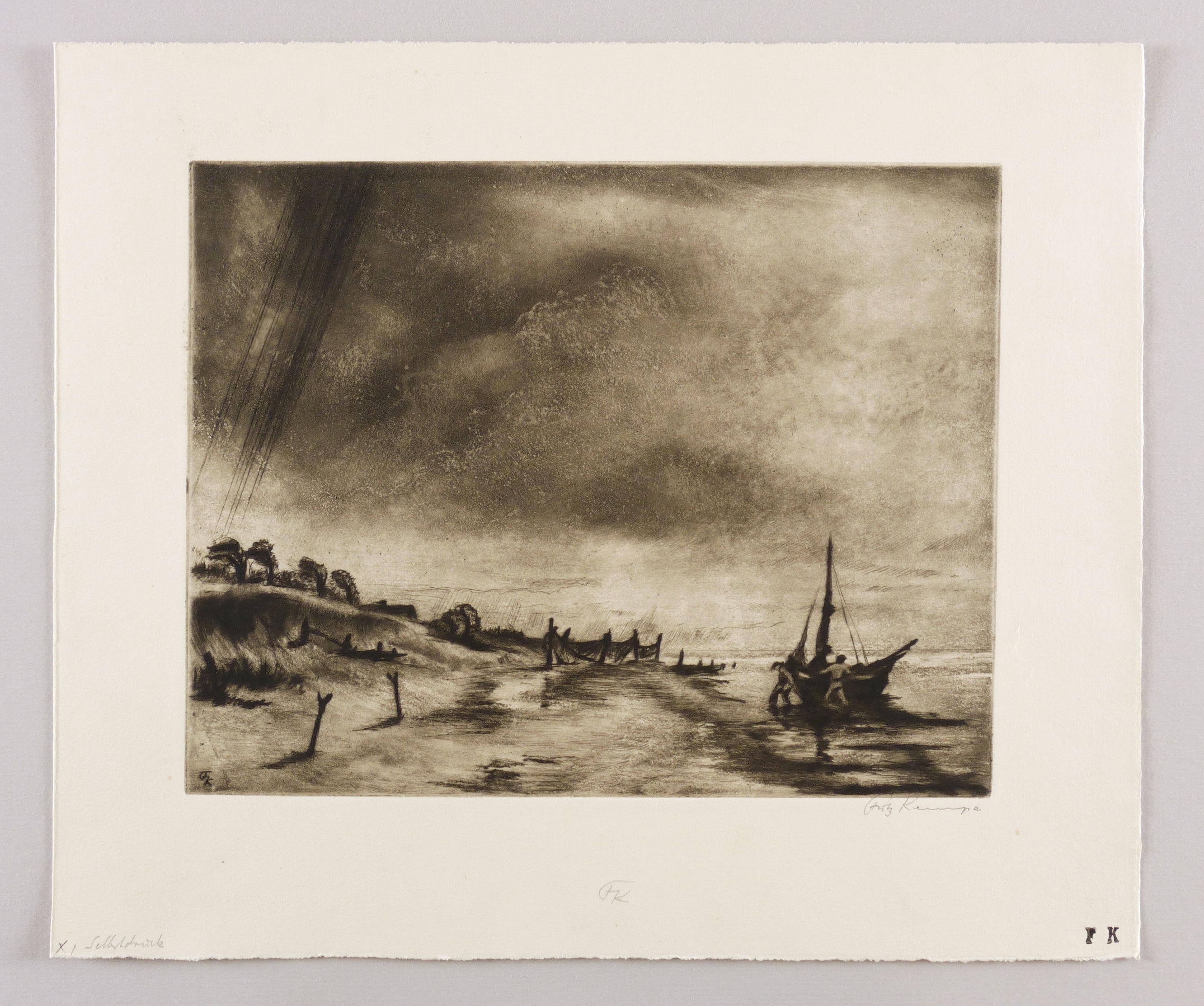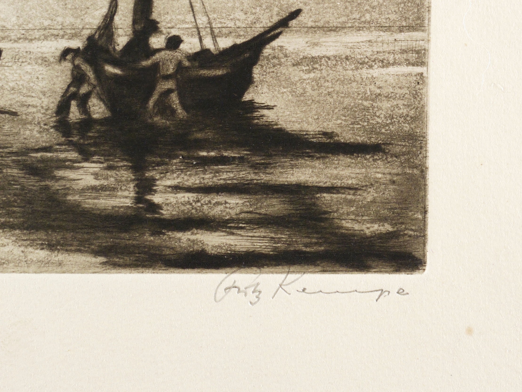 Rechts unten in Bleistift signiert: ″Fritz Kempe″. Am Blattrand unten bezeichnet und monogrammiert: ″x3 Selbstdruck / FK″. In der rechten unteren Blattecke Monogramm-Stempel des Künstlers. In der Platte links unten nochmals Monogramm. – Tadellos erhalten. Sehr guter Zustand.