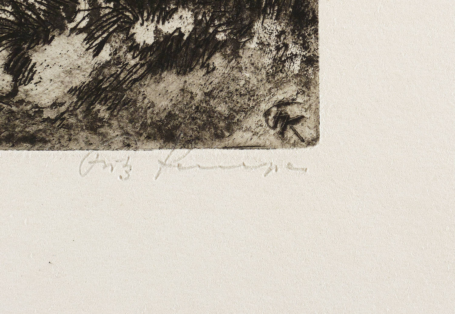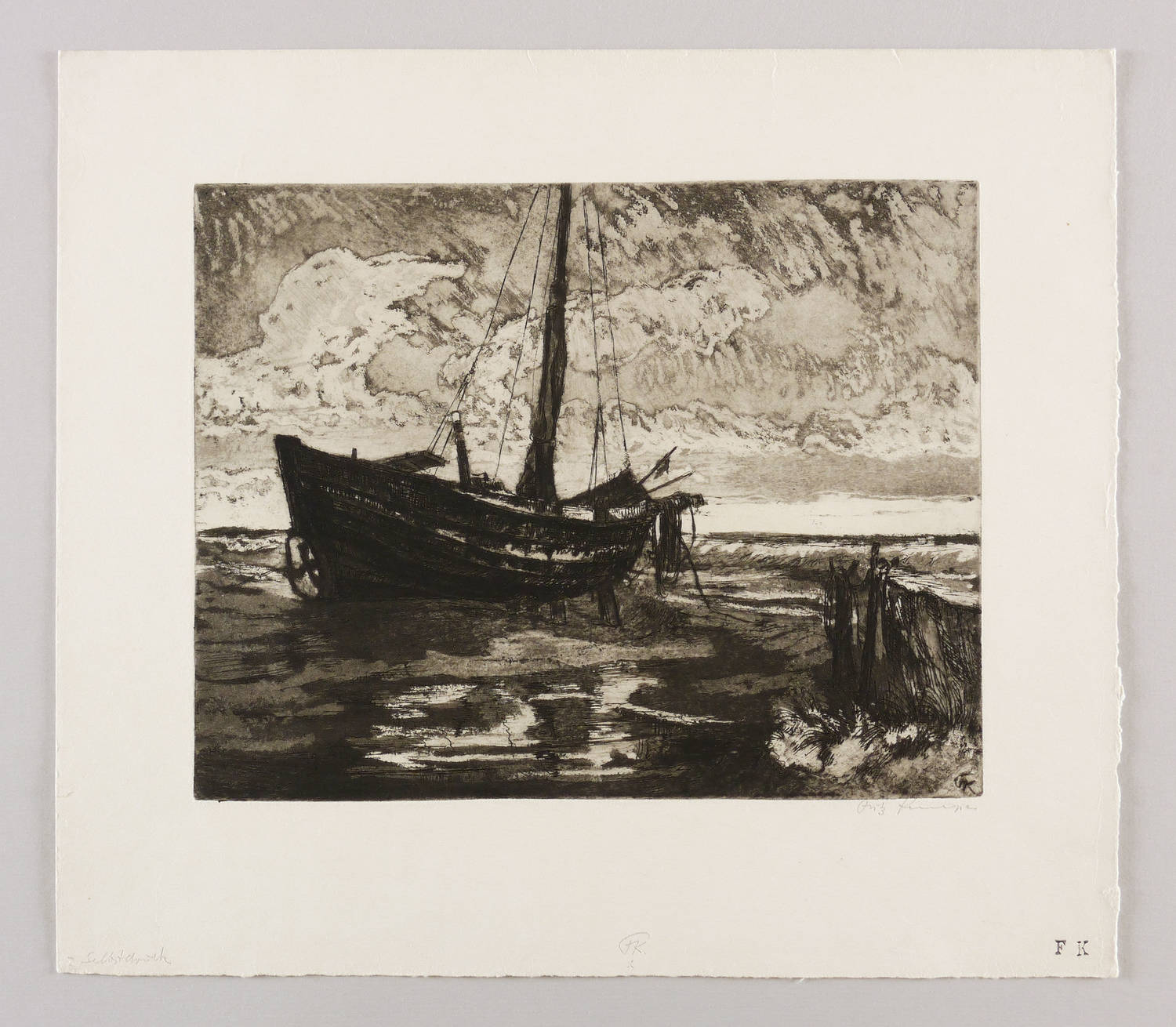 Rechts unten in Bleistift signiert: ″Fritz Kempe″. Am unteren Blattrand bezeichnet: ″Selbstdruck / FK″. Dazu Stempel-Monogramm. In der Platte rechts unten nochmals Monogramm. – Herausragendes druckgrafisches Werk des Künstlers. – Leichte Randmängel, Ecke links unten bestoßen, links winziger Randriss. Papier von frischer Wirkung. Insgesamt immerhin noch guter Zustand.