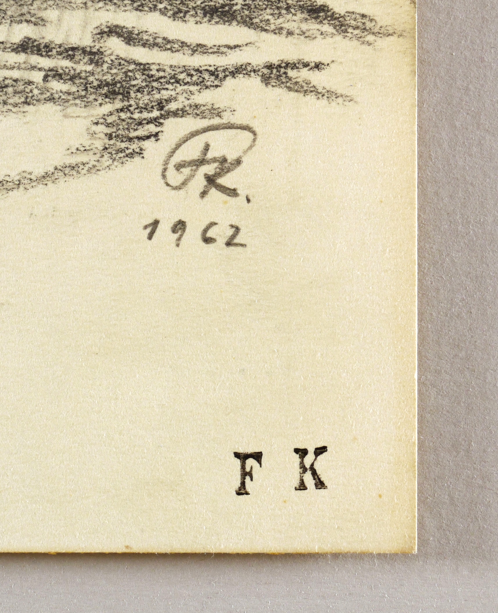 Rechts unten in Bleistift mit Monogramm signiert und datiert: ″FK. 1962″. In der linken unteren Blattecke bezeichnet: ″Der Unersättliche. 'Ein Hecht'″. Rechts Monogramm-Stempel. – Charakteristisches schönes Blatt aus dem Dresdner Spätwerk des sächsischen Künstlers. - Aus der Umgebung von Dresden, etwa dem Gebergrund bei Nickern. Mit Anmutung an die Landschaften und den Zeichenstil des Thüringer Künstlers Otto Paetz. – Die oberen Blattecken rückseitig mit leichten Montageresten. Sehr guter Zustand.